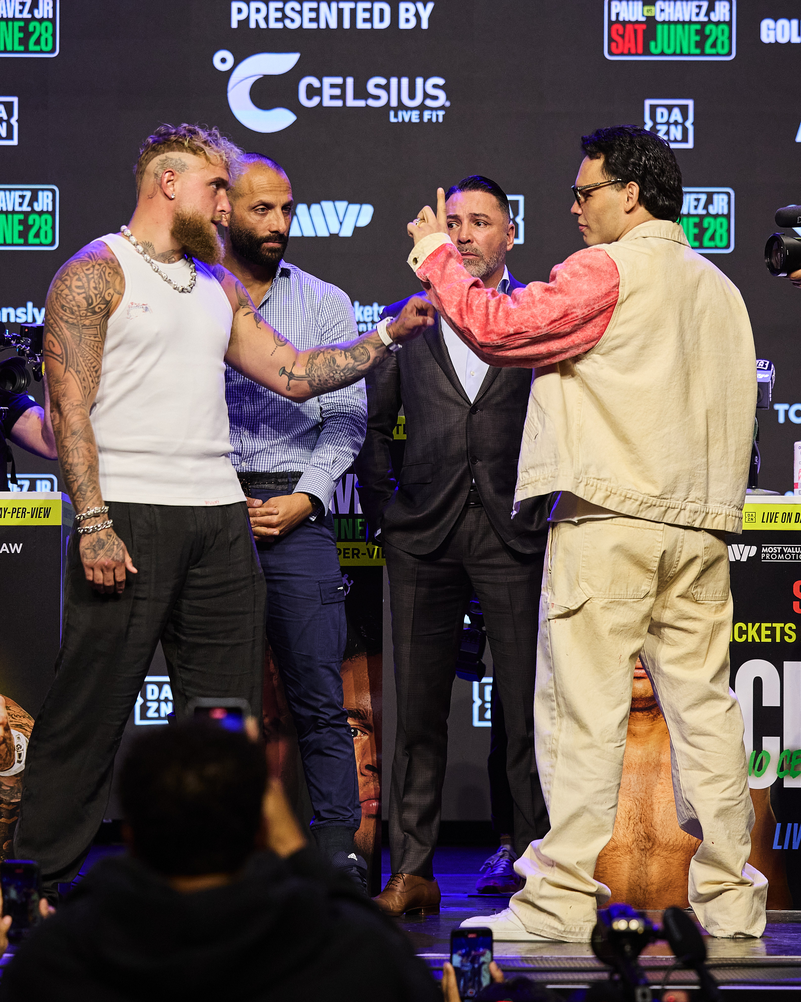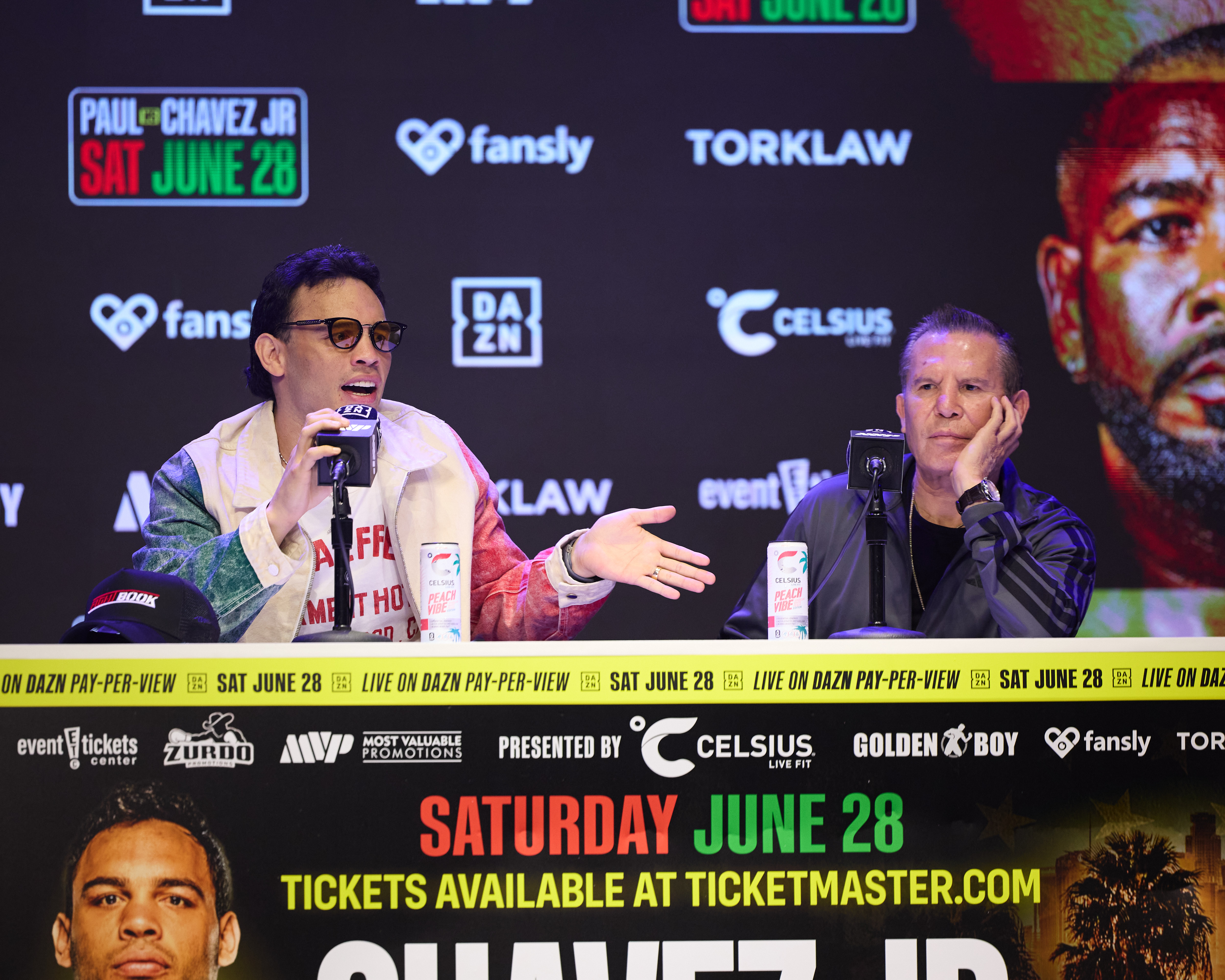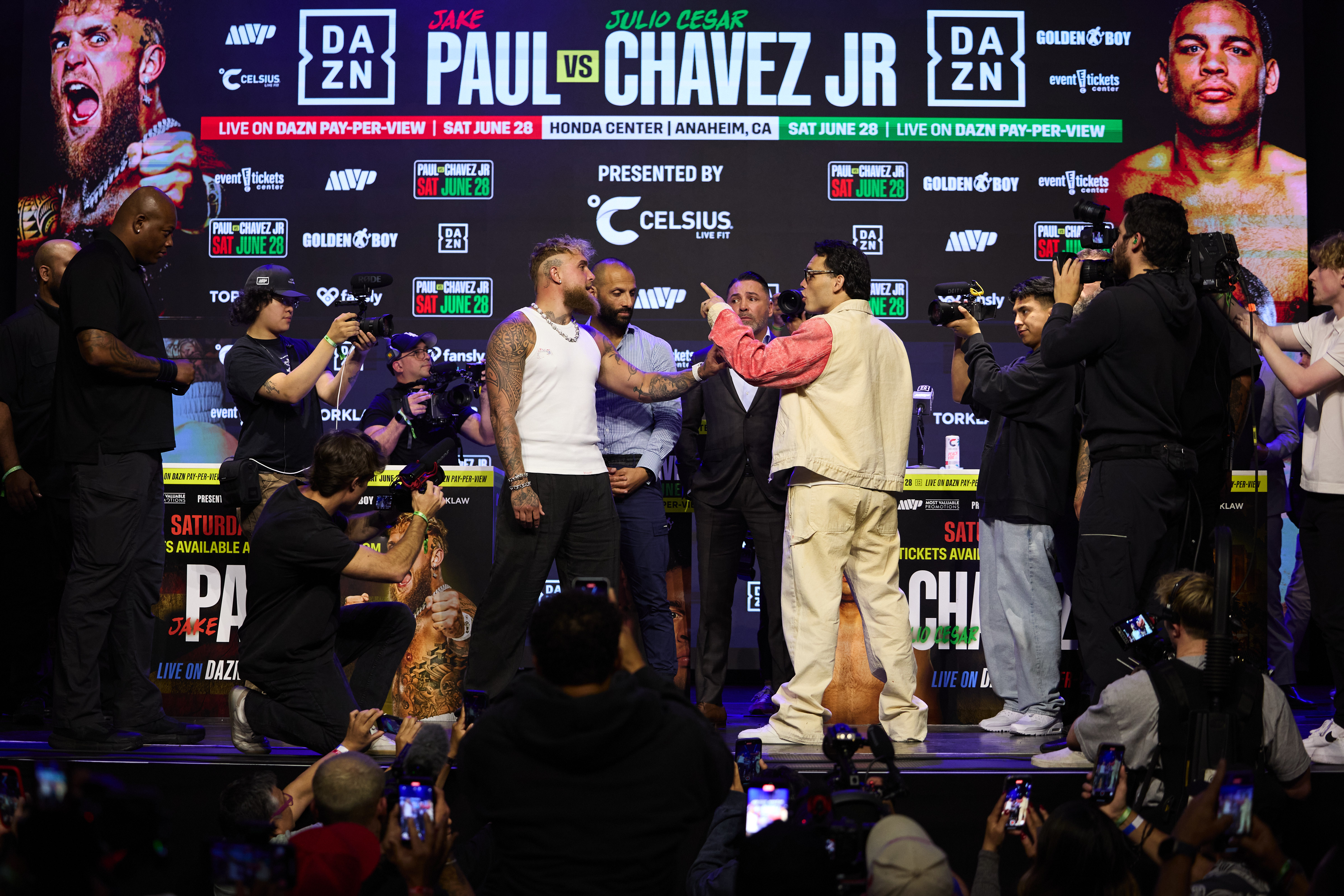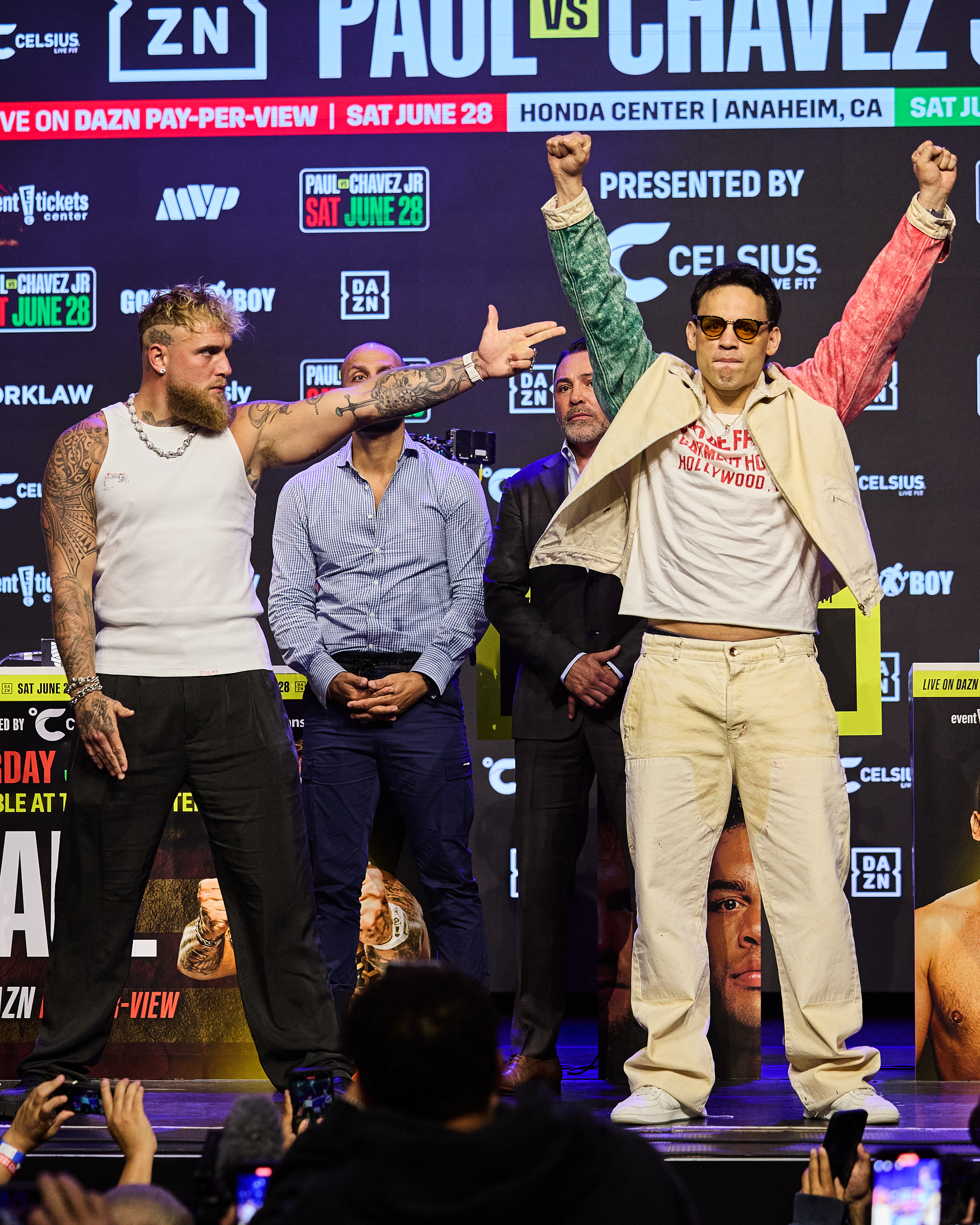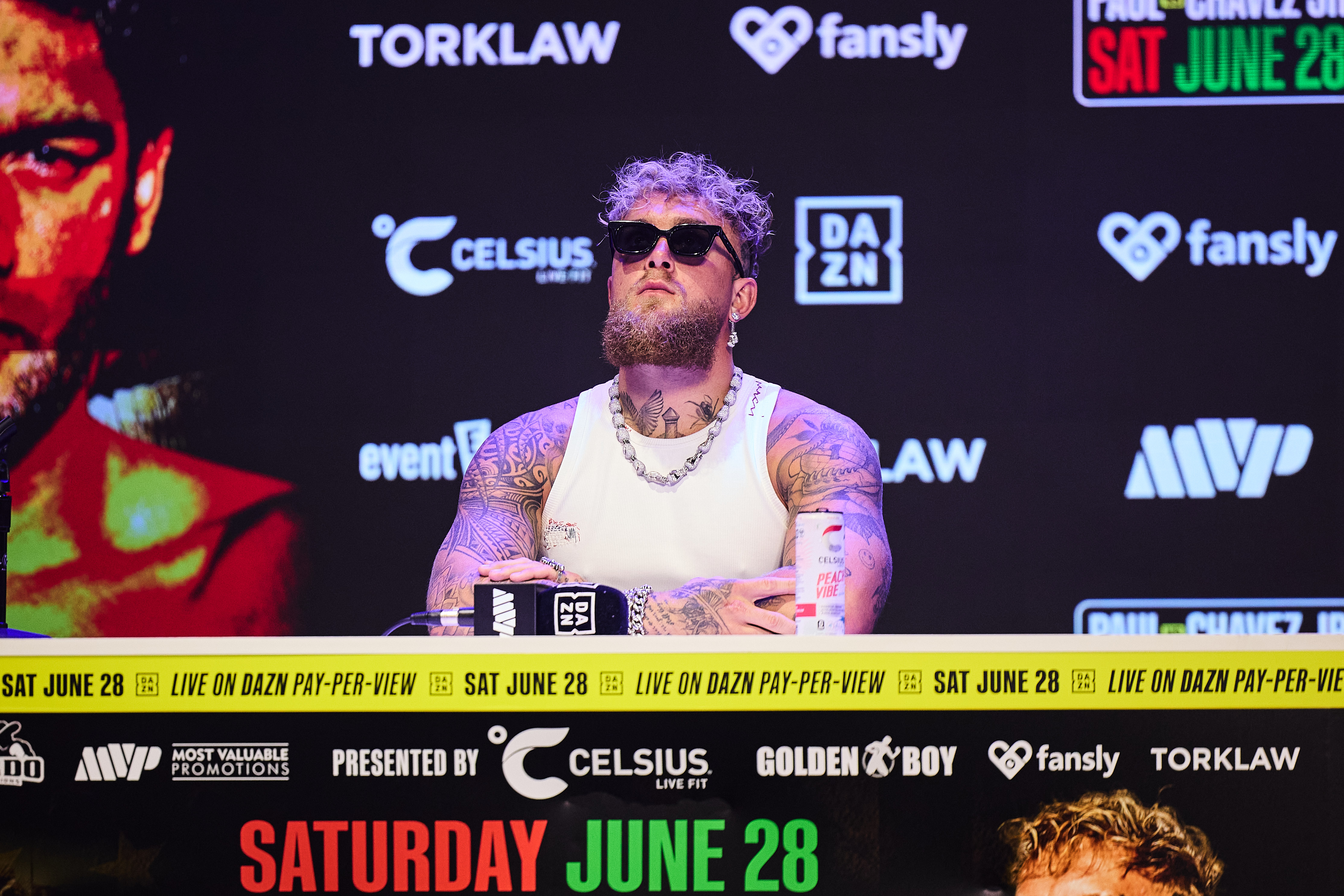 LOS ANGELES, CA – Today at the Avalon Hollywood Theater in Los Angeles, CA, The Problem Child, Jake “El Gallo de Dorado” Paul (11-1, 7 KOs) and Mexico’s former champion Julio Cesar Chavez Jr. (54-6-1, 34 KOs) met face-to-face to preview their highly anticipated Most Valuable Promotions (MVP) bout. This event will air live globally on DAZN pay-per-view on Saturday, June 28, from Honda Center in Anaheim, California, and is presented by CELSIUS Live Fit Essential Energy with Golden Boy Promotions serving as an official licensed promoter. Paul vs. Chavez is also sponsored by Event Ticket Center and Fansly. All tickets are on sale now via Ticketmaster