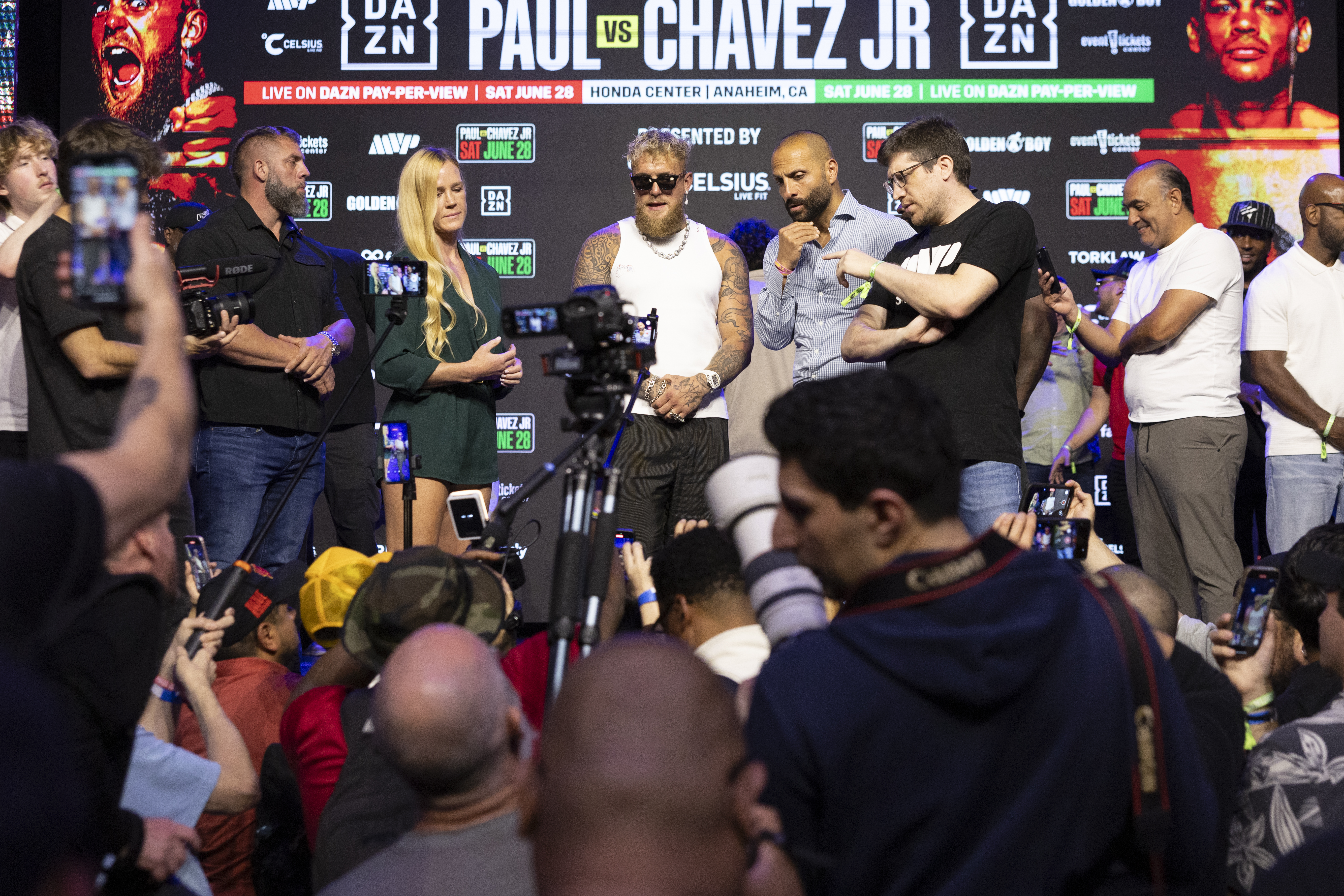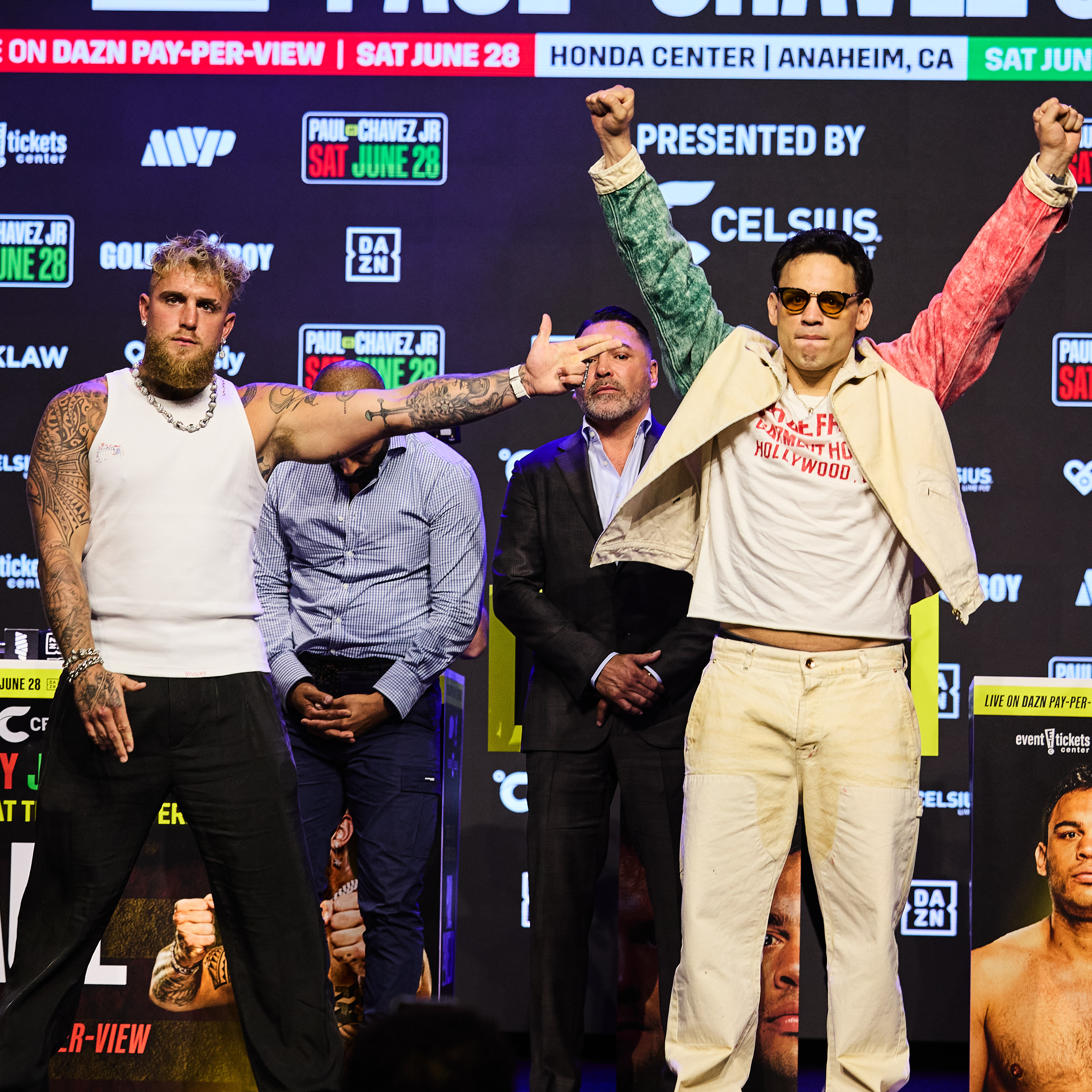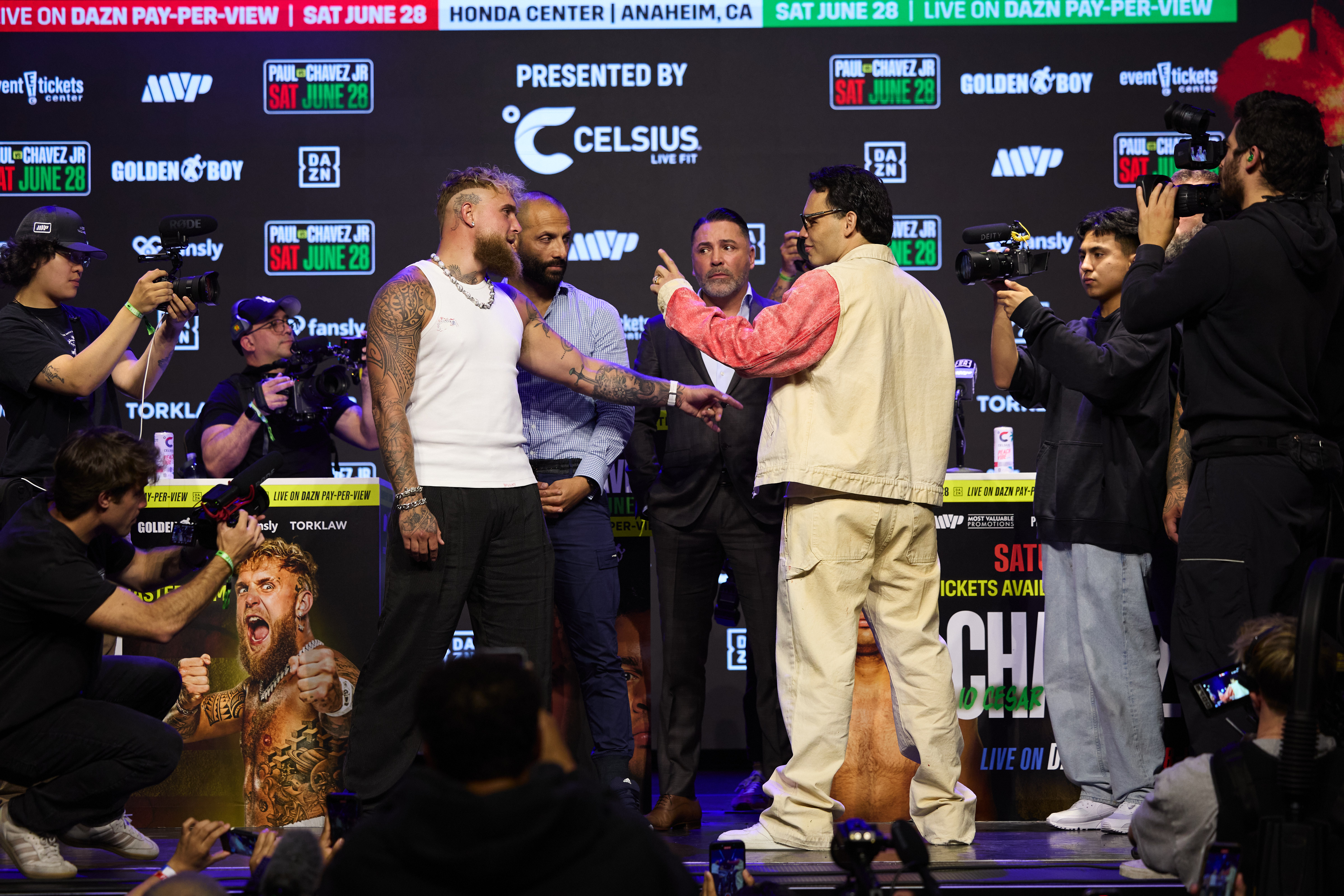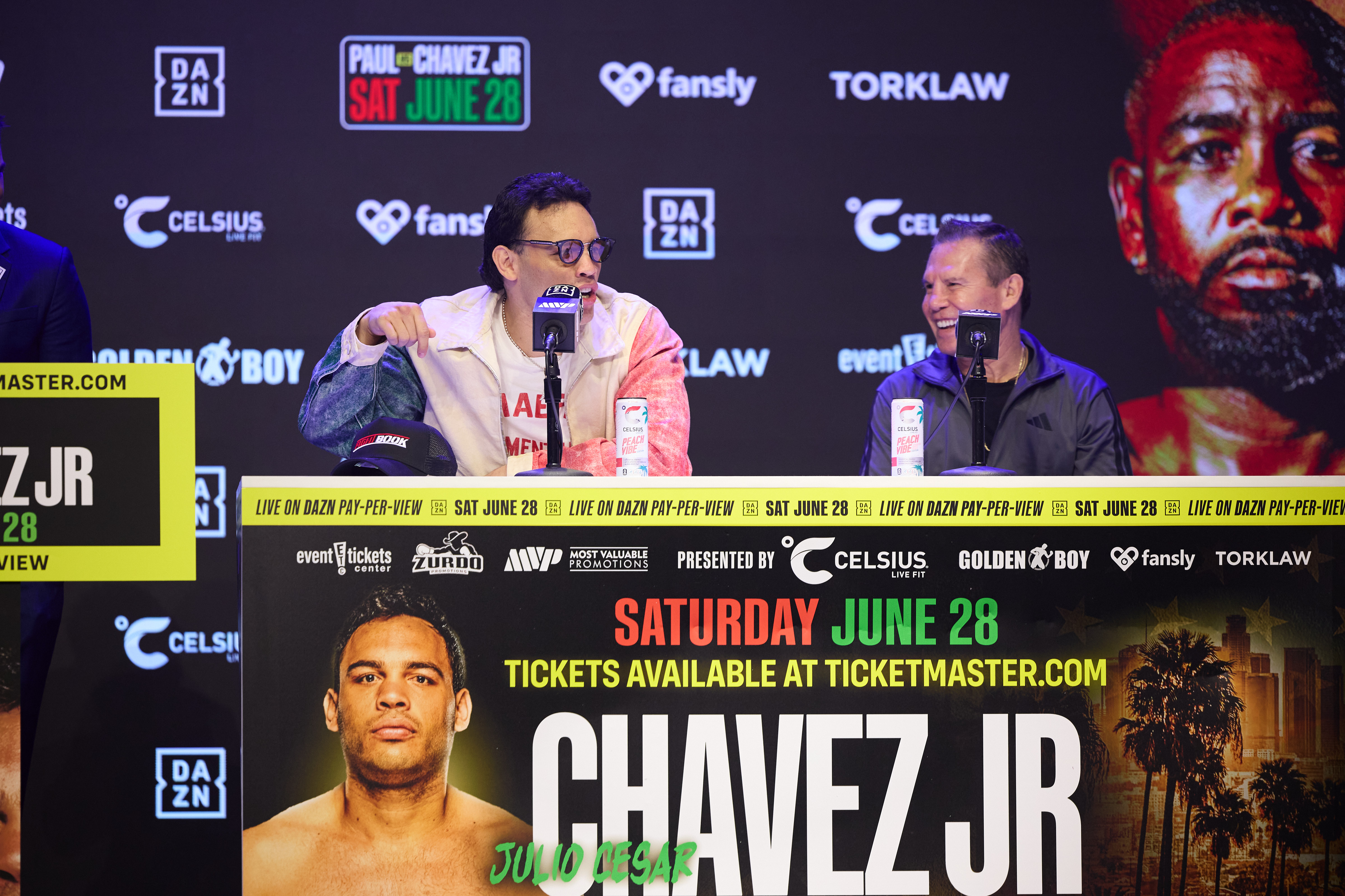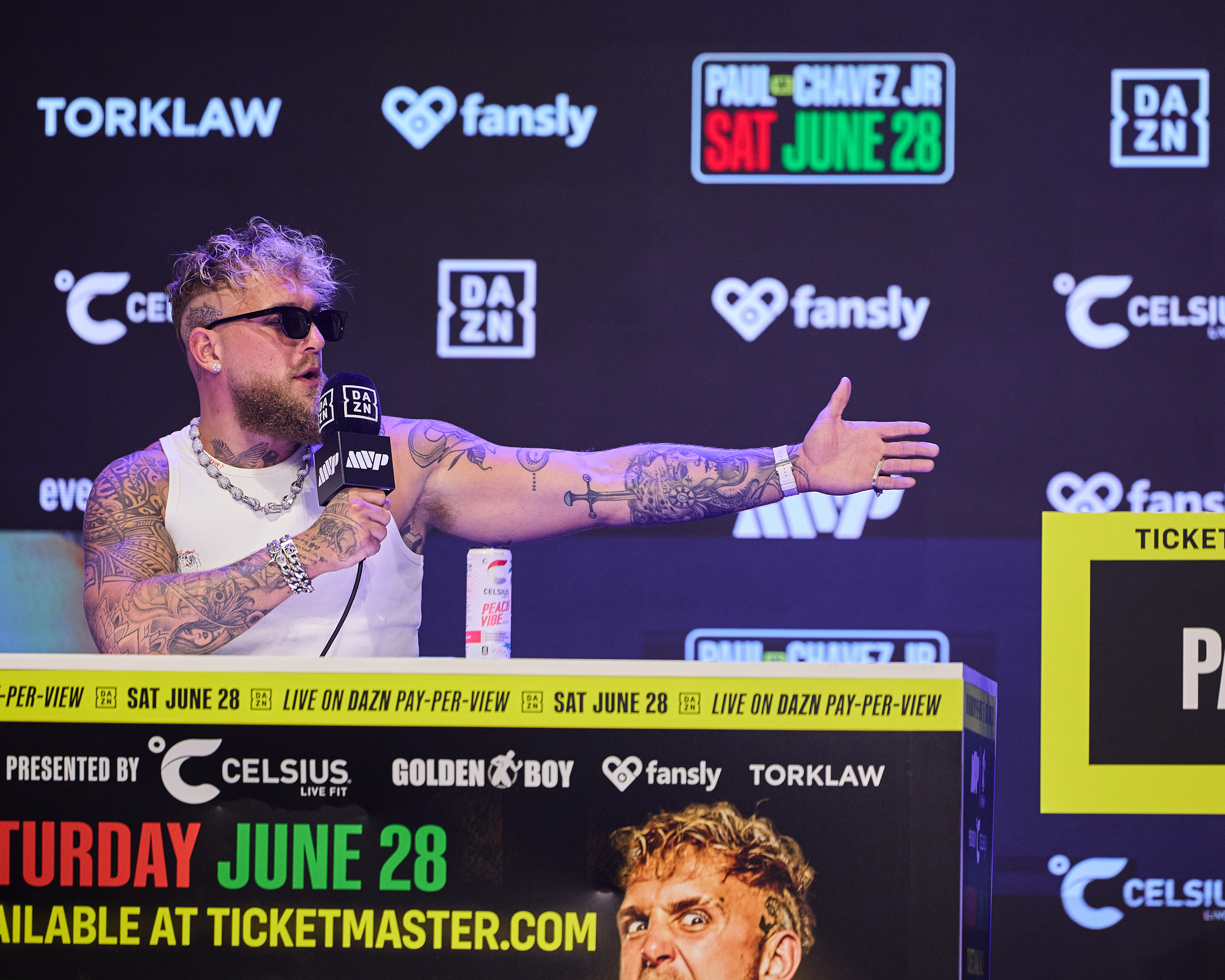 LOS ANGELES, CA – Today at the Avalon Hollywood Theater in Los Angeles, CA, The Problem Child, Jake “El Gallo de Dorado” Paul (11-1, 7 KOs) and Mexico’s former champion Julio Cesar Chavez Jr. (54-6-1, 34 KOs) met face-to-face to preview their highly anticipated Most Valuable Promotions (MVP) bout. This event will air live globally on DAZN pay-per-view on Saturday, June 28, from Honda Center in Anaheim, California, and is presented by CELSIUS Live Fit Essential Energy with Golden Boy Promotions serving as an official licensed promoter. Paul vs. Chavez is also sponsored by Event Ticket Center and Fansly. All tickets are on sale now via Ticketmaster