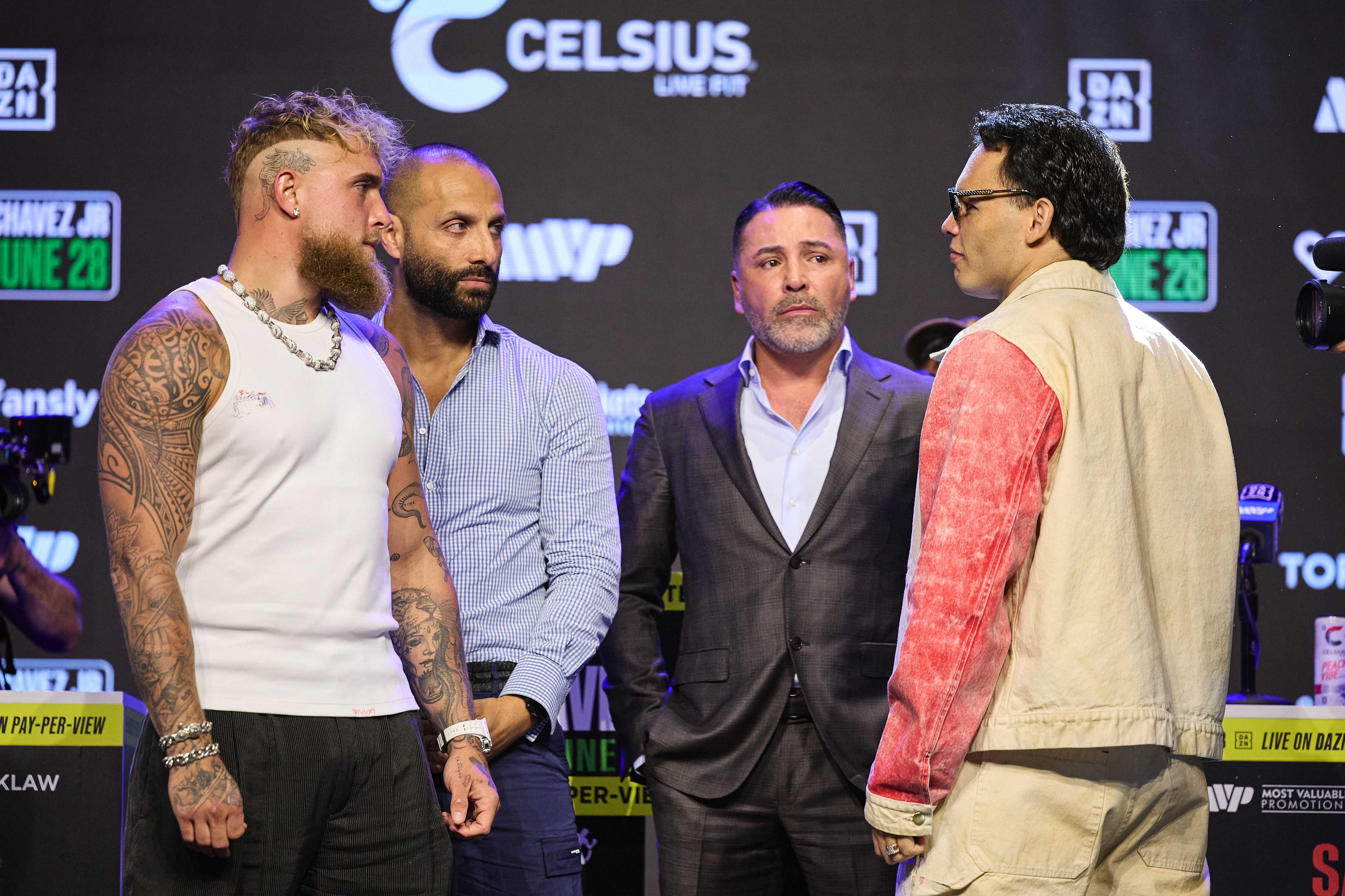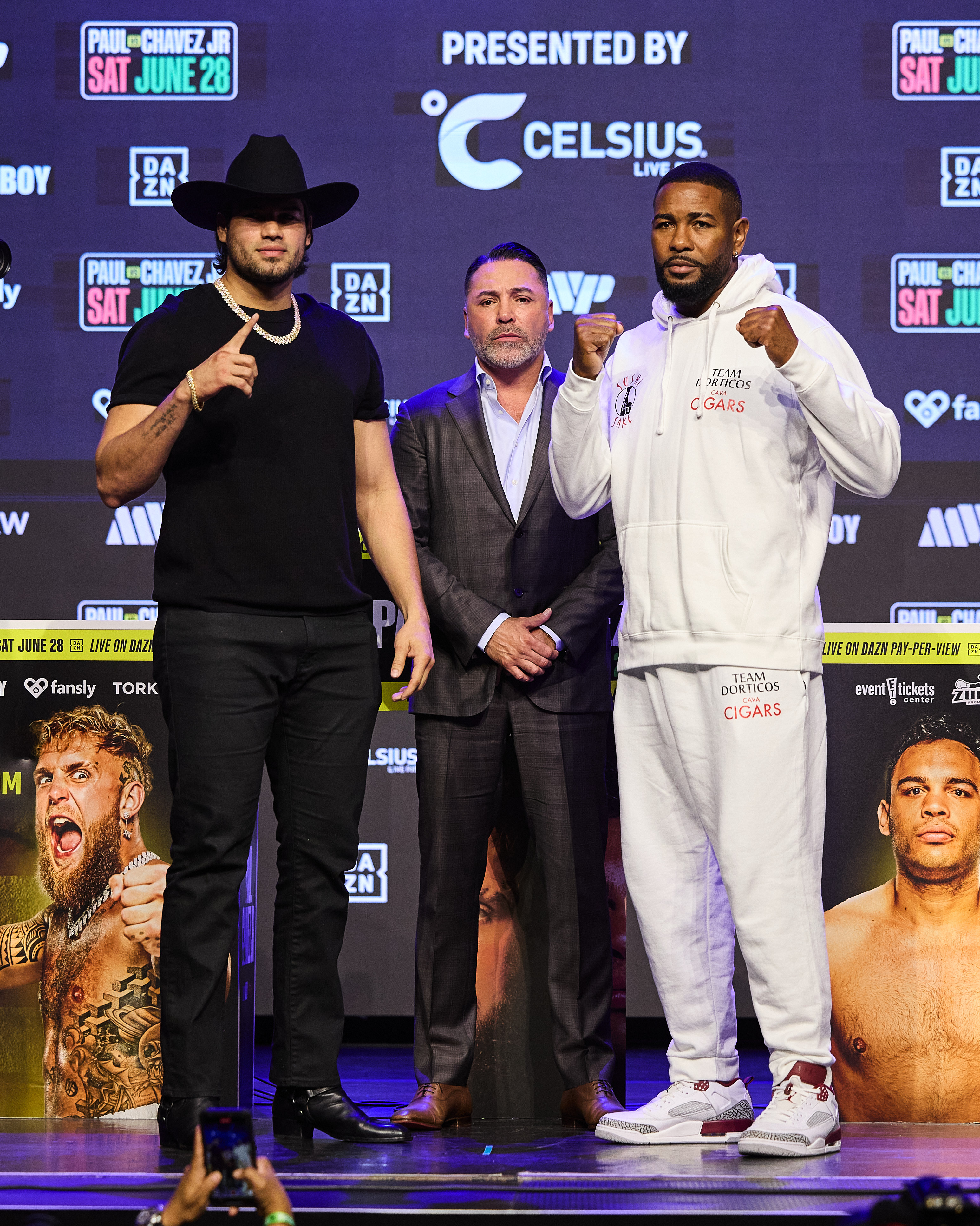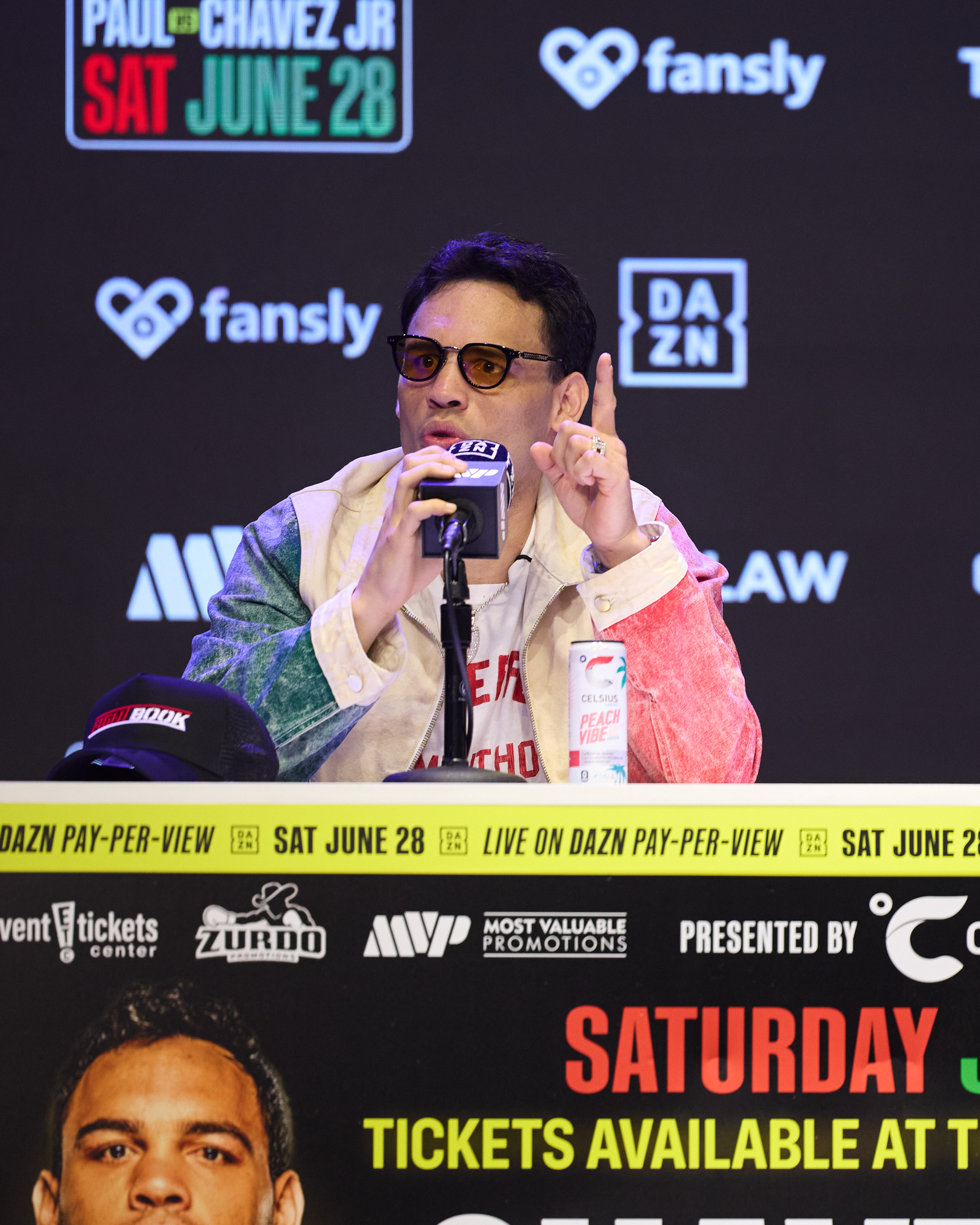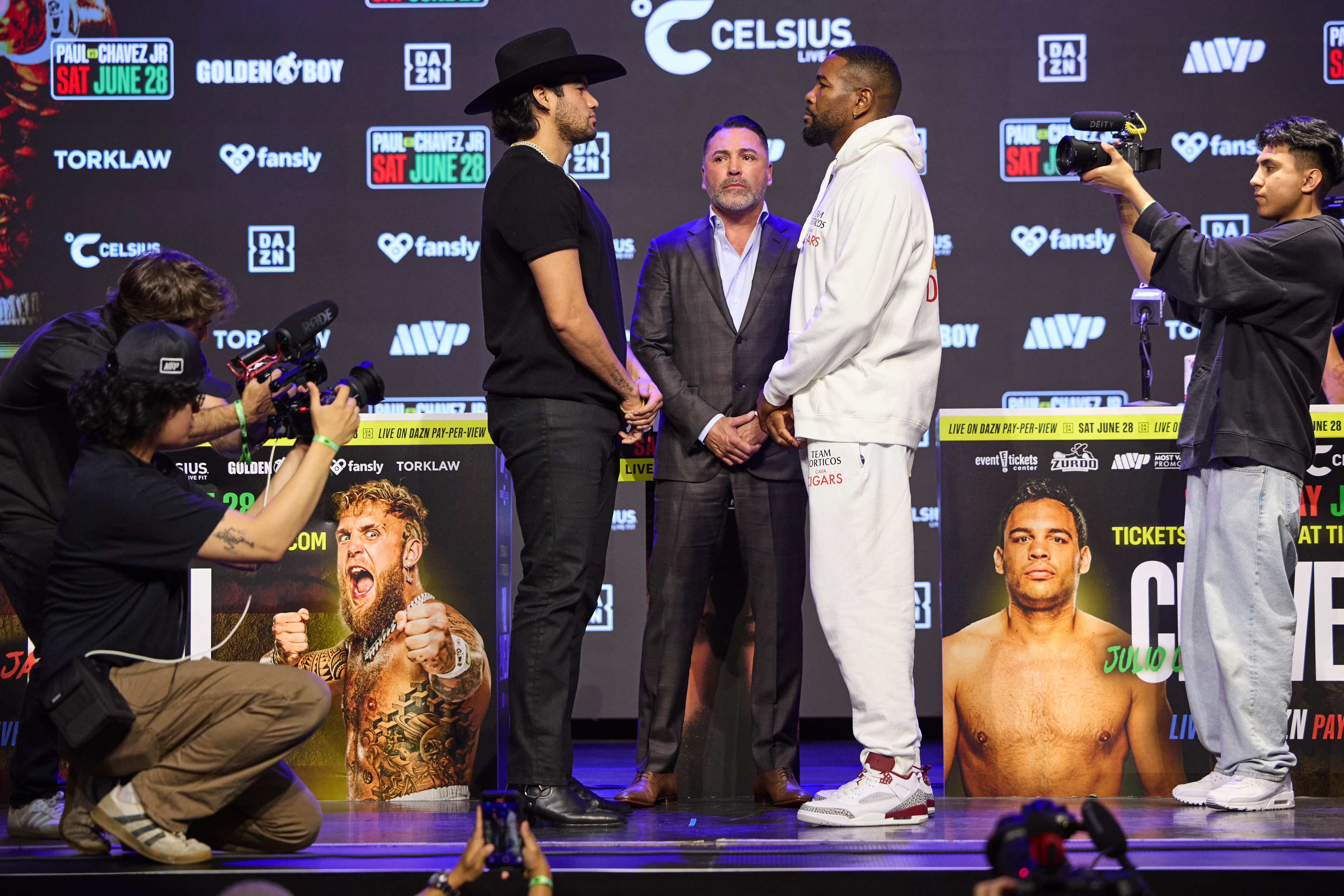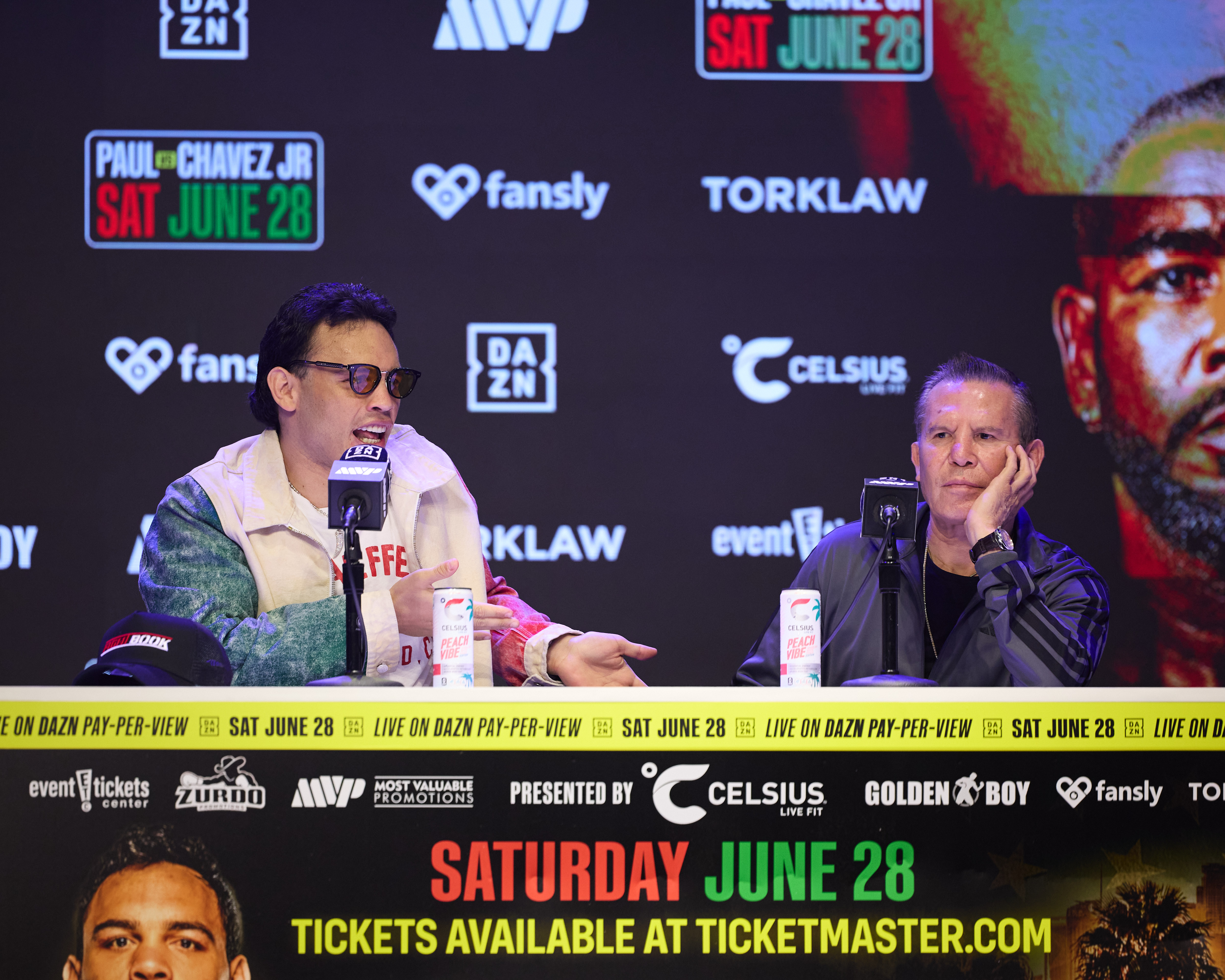 LOS ANGELES, CA – Today at the Avalon Hollywood Theater in Los Angeles, CA, The Problem Child, Jake “El Gallo de Dorado” Paul (11-1, 7 KOs) and Mexico’s former champion Julio Cesar Chavez Jr. (54-6-1, 34 KOs) met face-to-face to preview their highly anticipated Most Valuable Promotions (MVP) bout. This event will air live globally on DAZN pay-per-view on Saturday, June 28, from Honda Center in Anaheim, California, and is presented by CELSIUS Live Fit Essential Energy with Golden Boy Promotions serving as an official licensed promoter. Paul vs. Chavez is also sponsored by Event Ticket Center and Fansly. All tickets are on sale now via Ticketmaster
