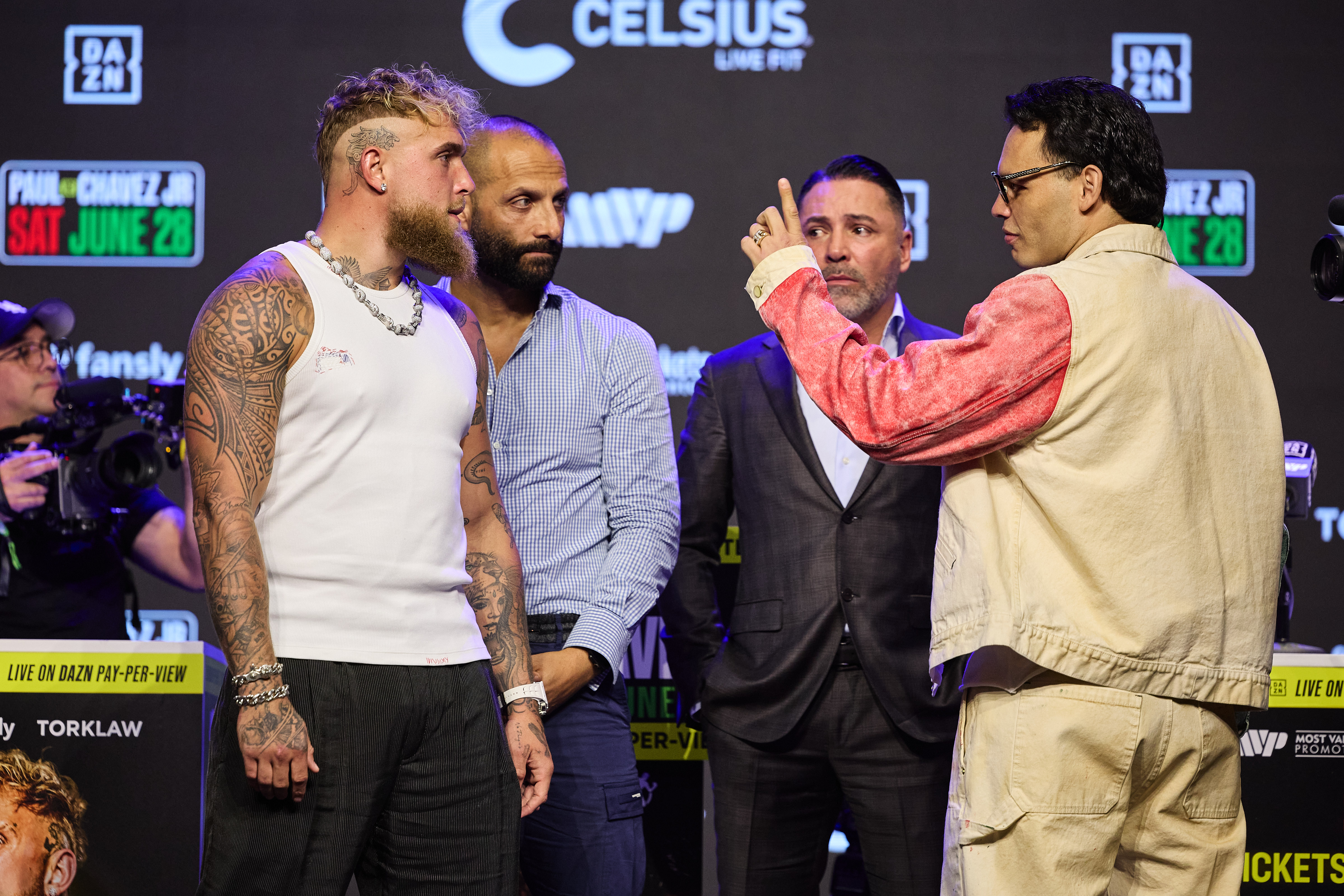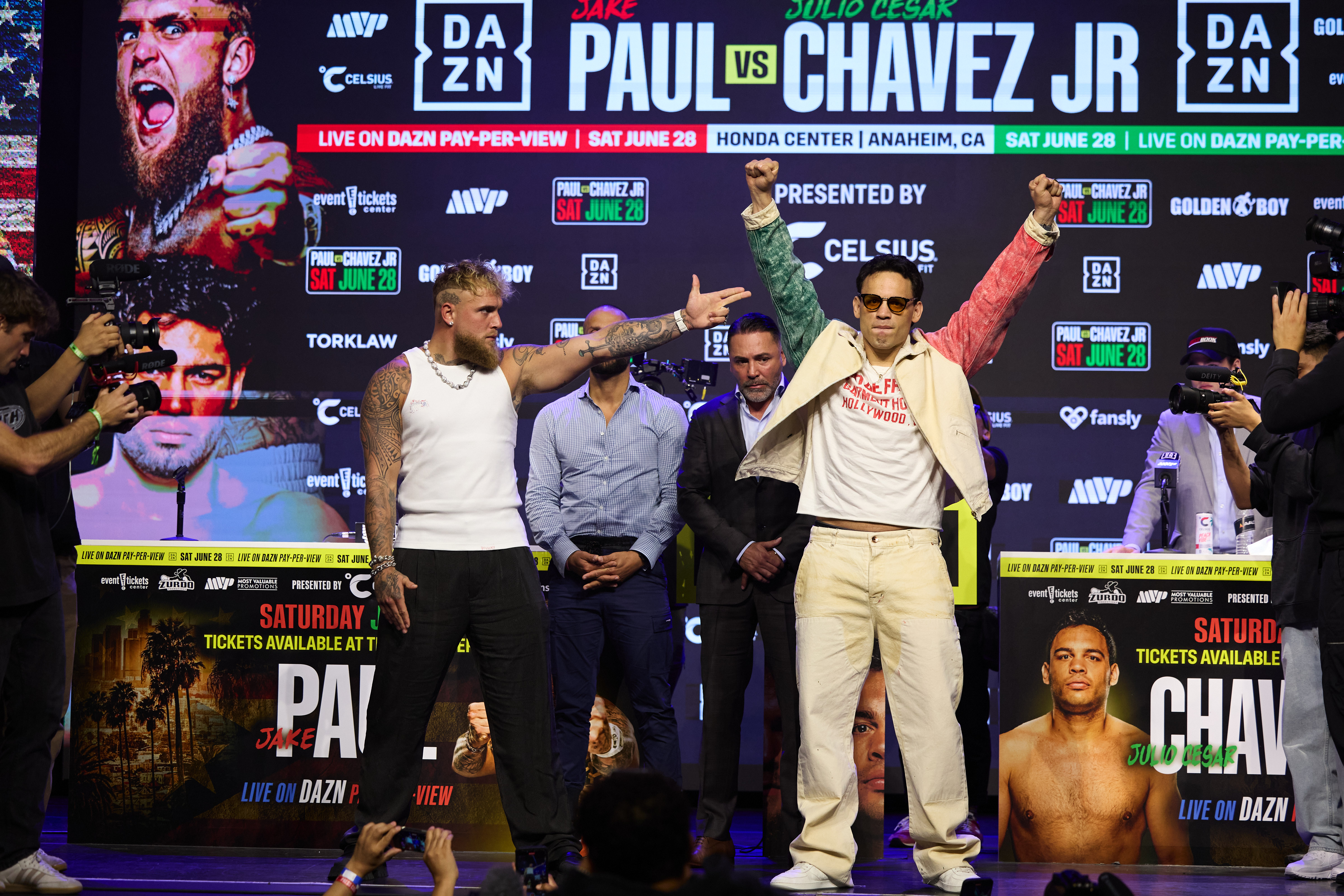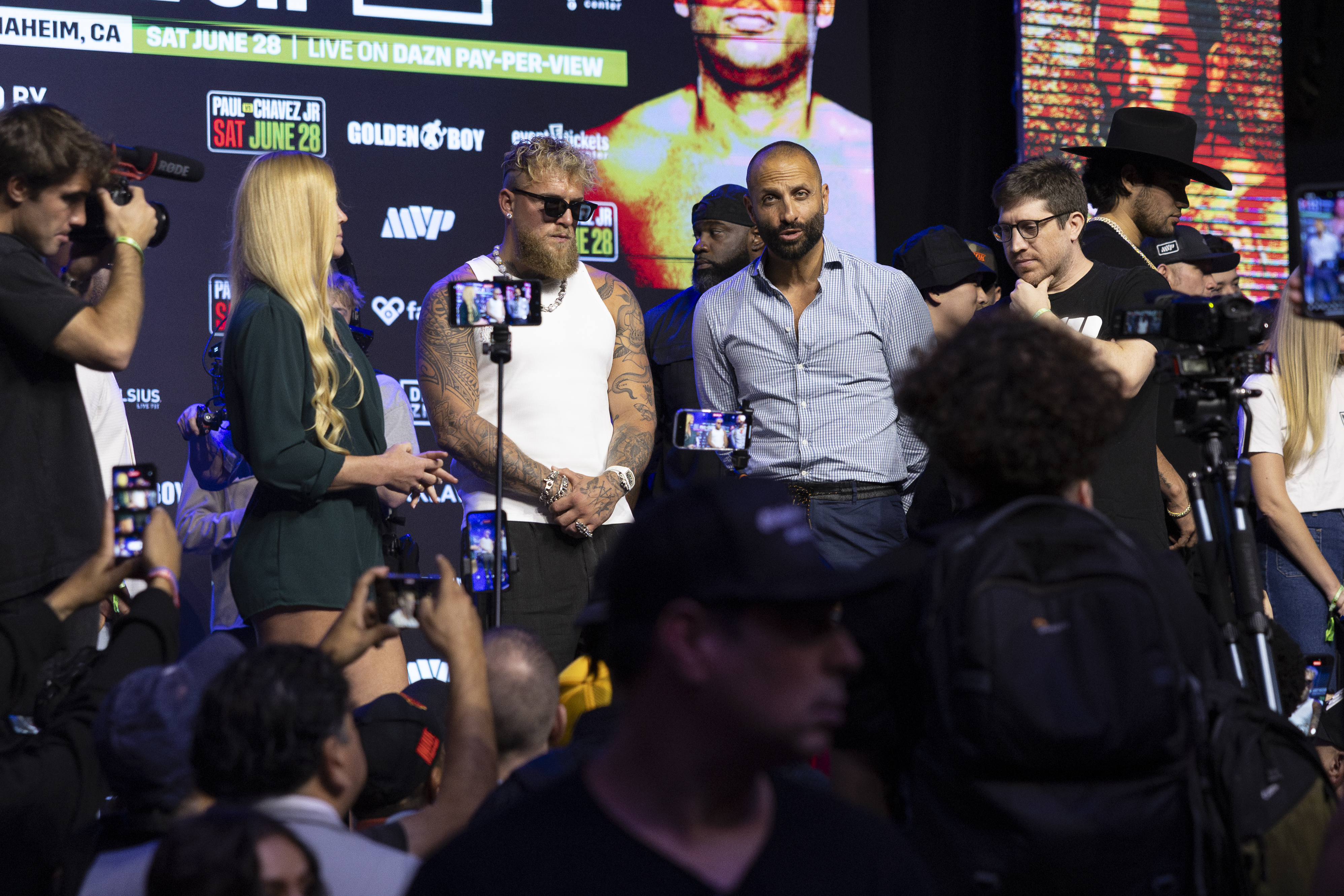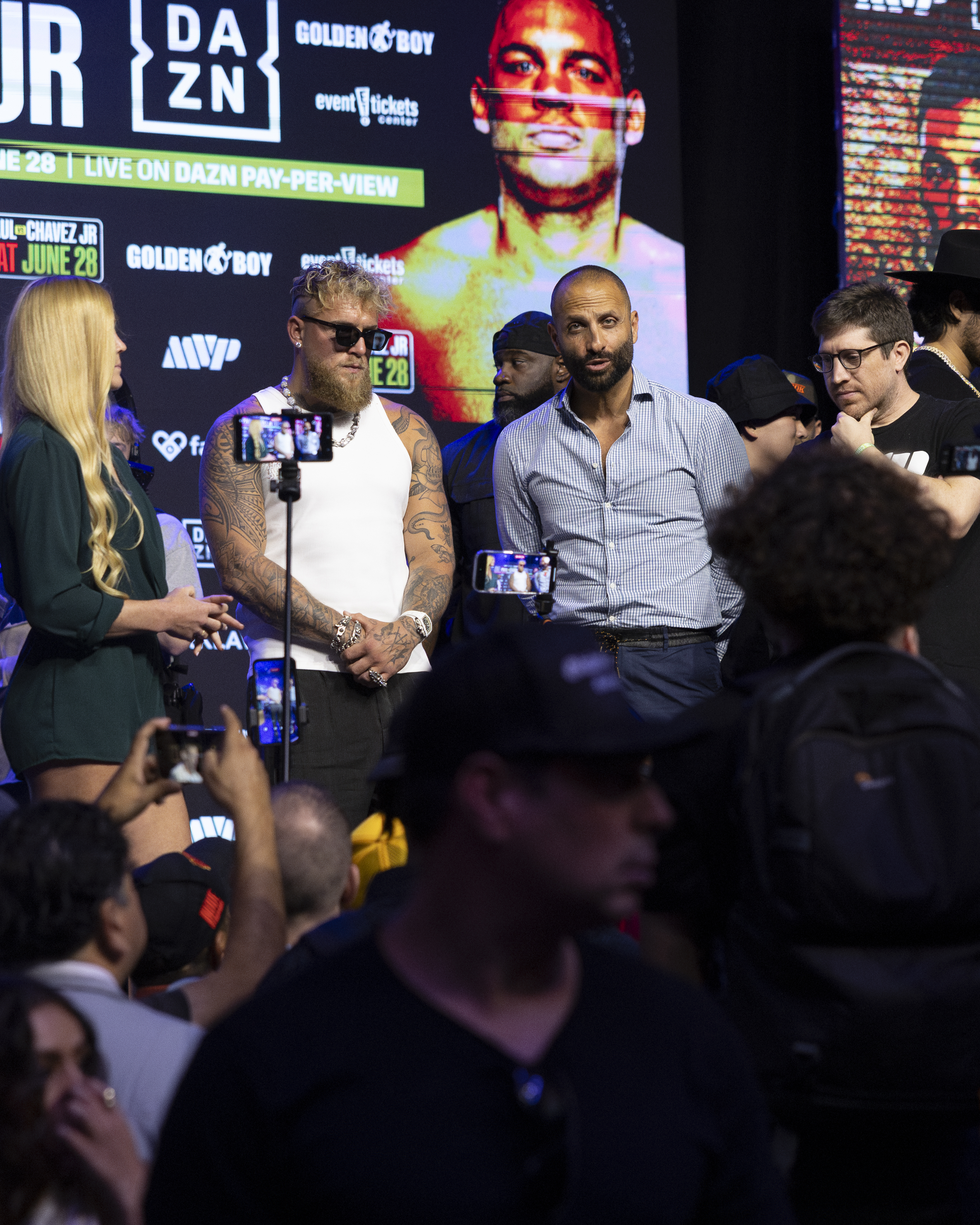 LOS ANGELES, CA – Today at the Avalon Hollywood Theater in Los Angeles, CA, The Problem Child, Jake “El Gallo de Dorado” Paul (11-1, 7 KOs) and Mexico’s former champion Julio Cesar Chavez Jr. (54-6-1, 34 KOs) met face-to-face to preview their highly anticipated Most Valuable Promotions (MVP) bout. This event will air live globally on DAZN pay-per-view on Saturday, June 28, from Honda Center in Anaheim, California, and is presented by CELSIUS Live Fit Essential Energy with Golden Boy Promotions serving as an official licensed promoter. Paul vs. Chavez is also sponsored by Event Ticket Center and Fansly. All tickets are on sale now via Ticketmaster