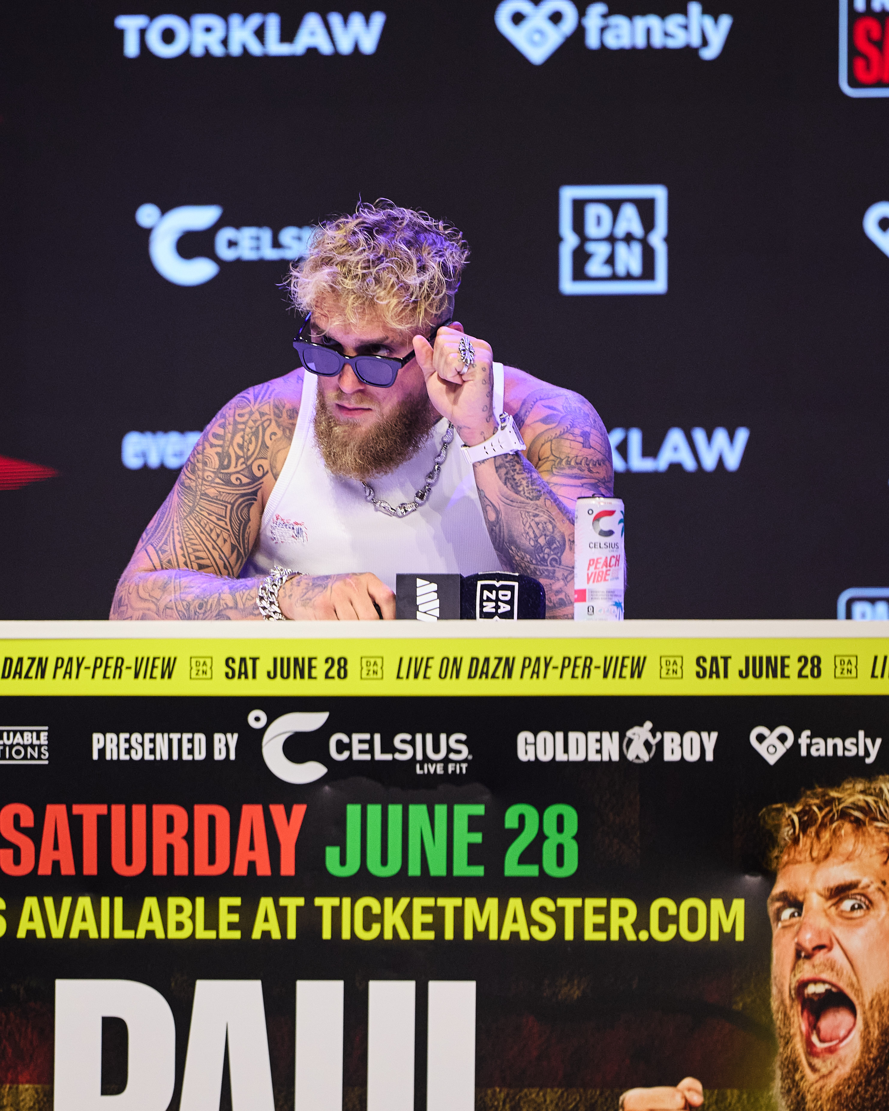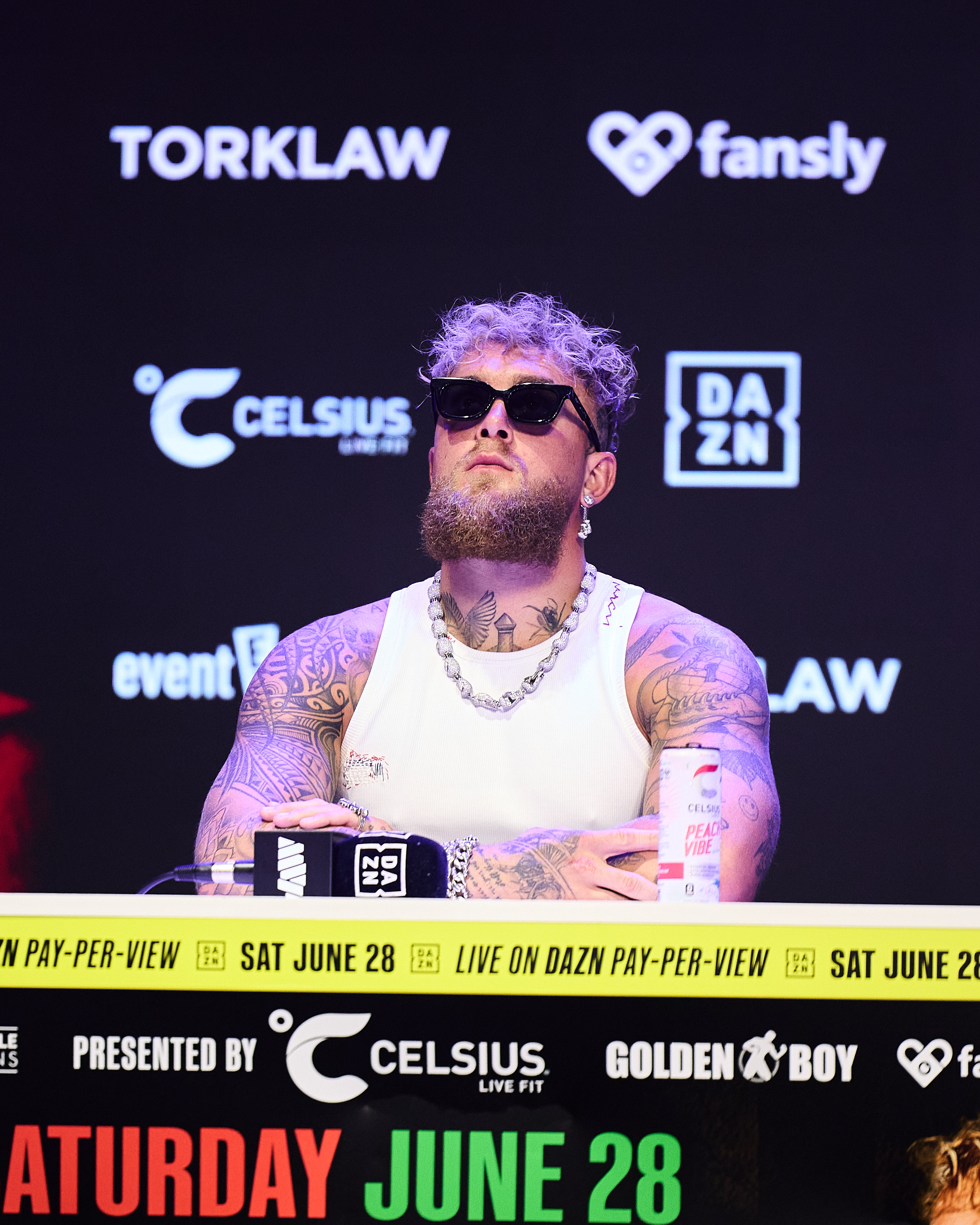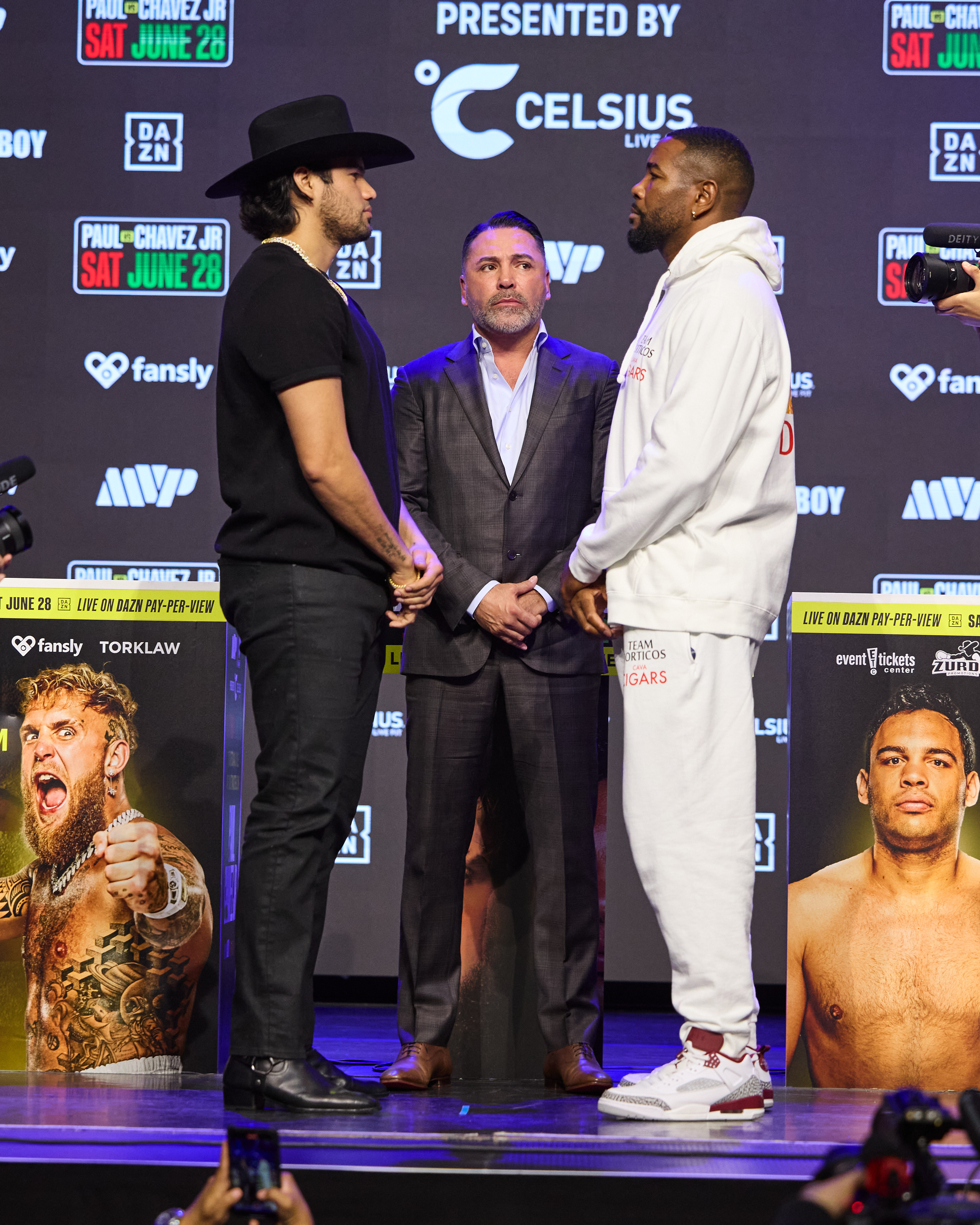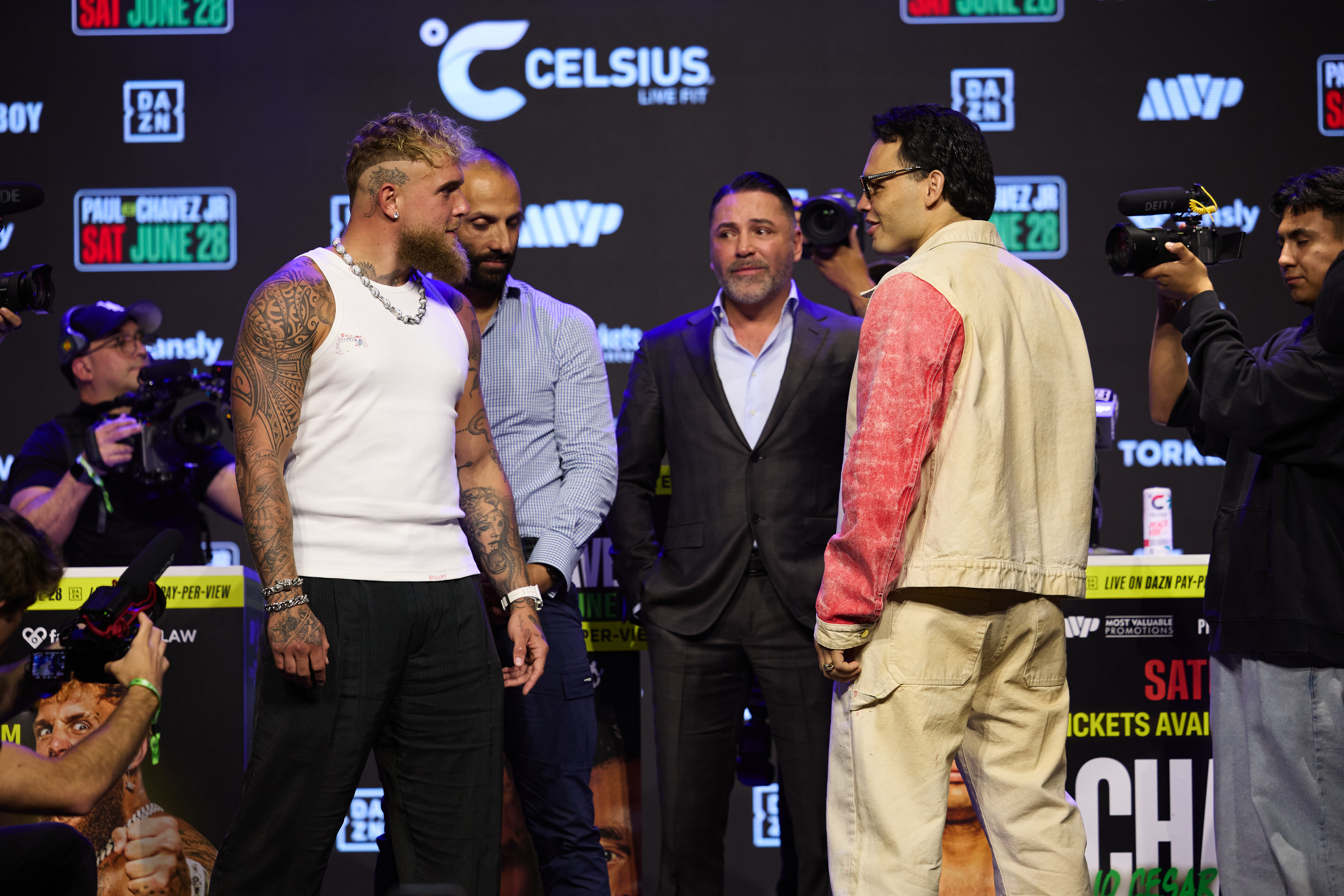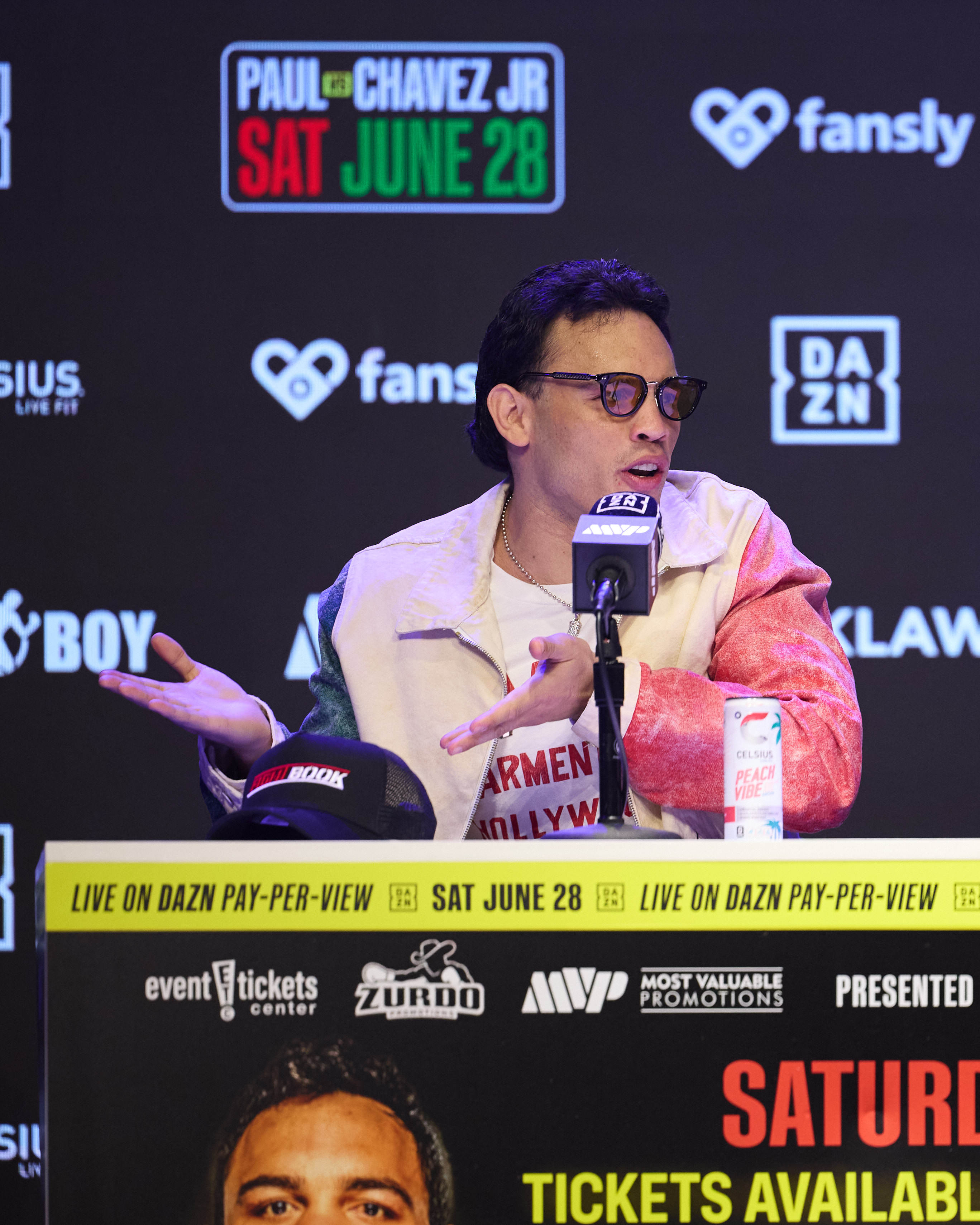 LOS ANGELES, CA – Today at the Avalon Hollywood Theater in Los Angeles, CA, The Problem Child, Jake “El Gallo de Dorado” Paul (11-1, 7 KOs) and Mexico’s former champion Julio Cesar Chavez Jr. (54-6-1, 34 KOs) met face-to-face to preview their highly anticipated Most Valuable Promotions (MVP) bout. This event will air live globally on DAZN pay-per-view on Saturday, June 28, from Honda Center in Anaheim, California, and is presented by CELSIUS Live Fit Essential Energy with Golden Boy Promotions serving as an official licensed promoter. Paul vs. Chavez is also sponsored by Event Ticket Center and Fansly. All tickets are on sale now via Ticketmaster