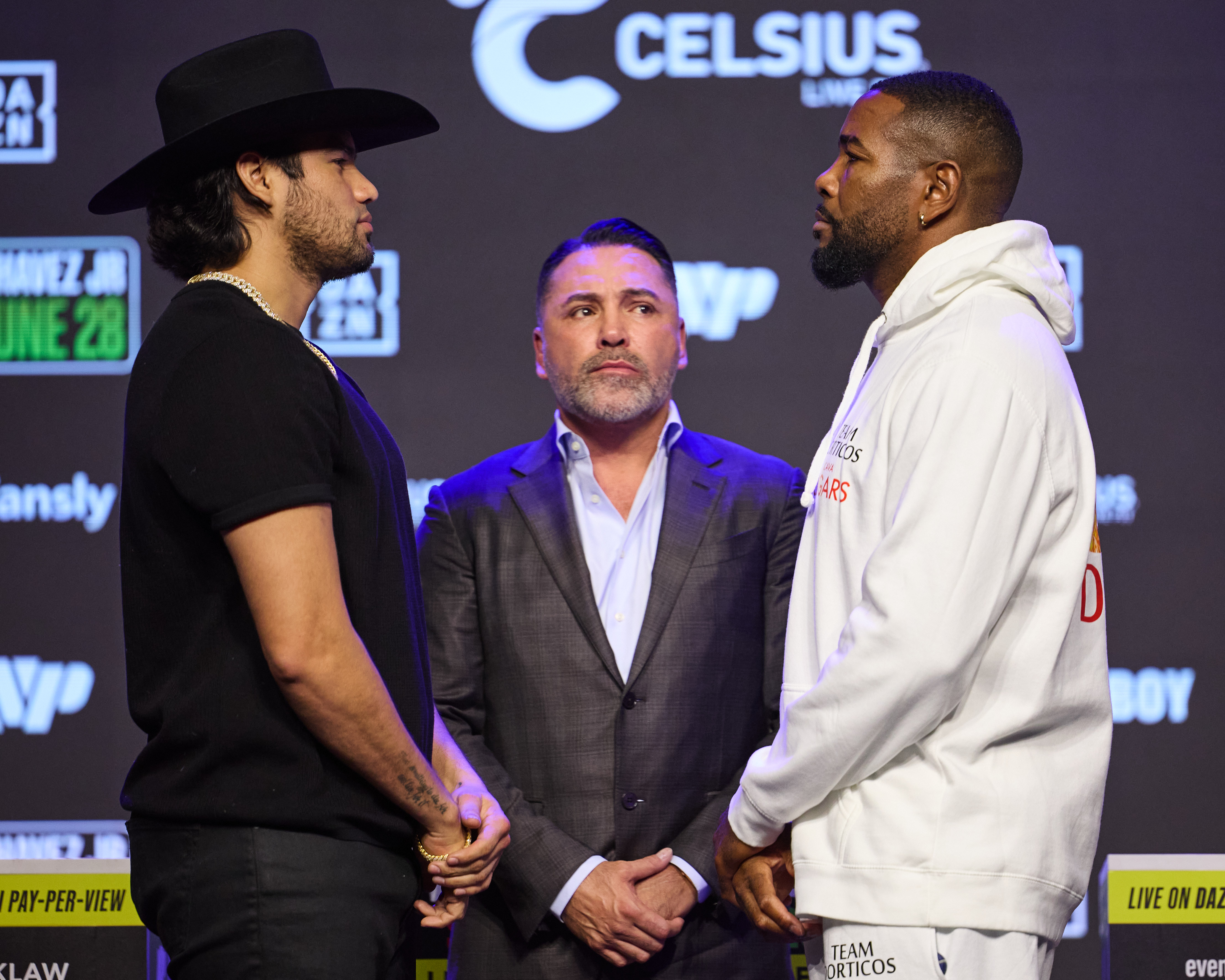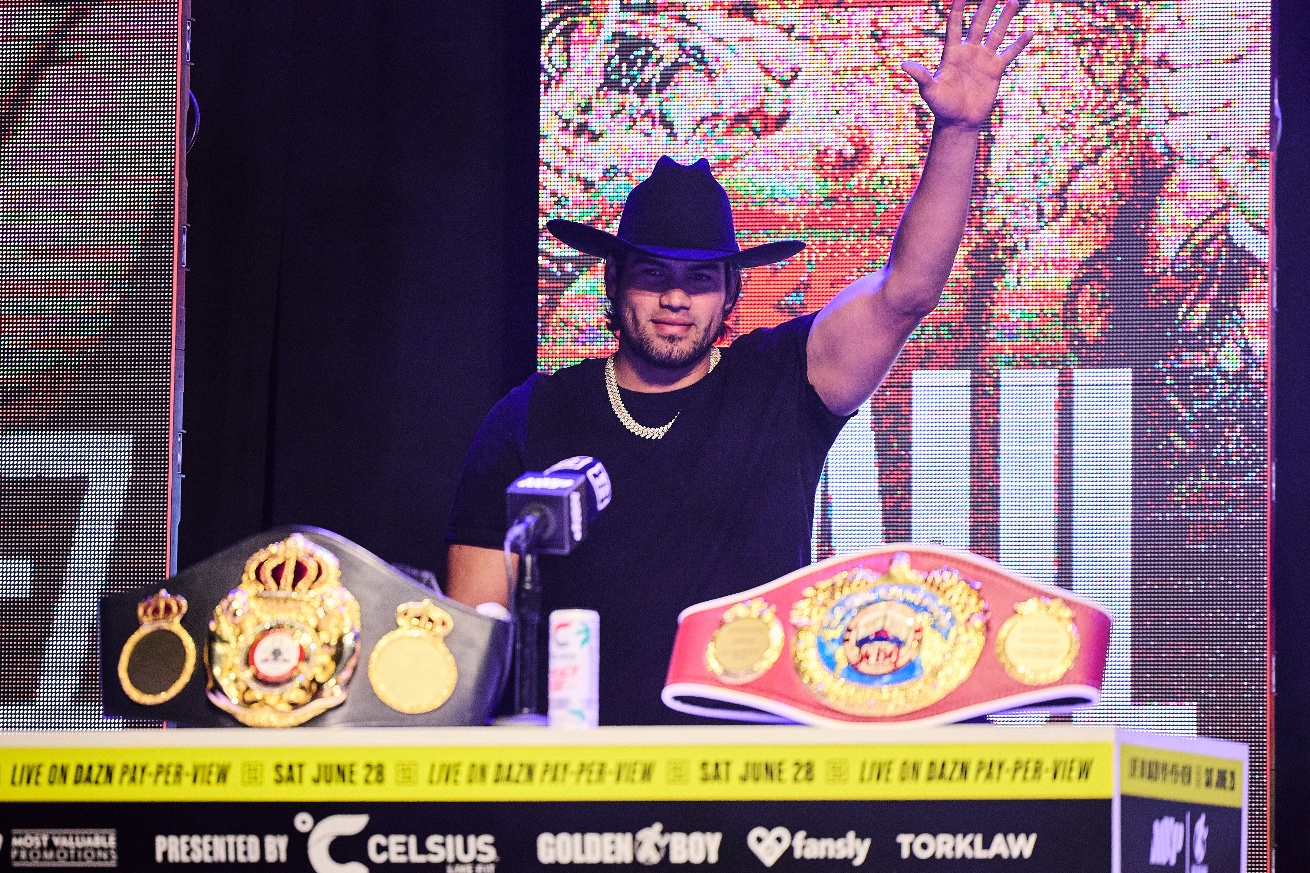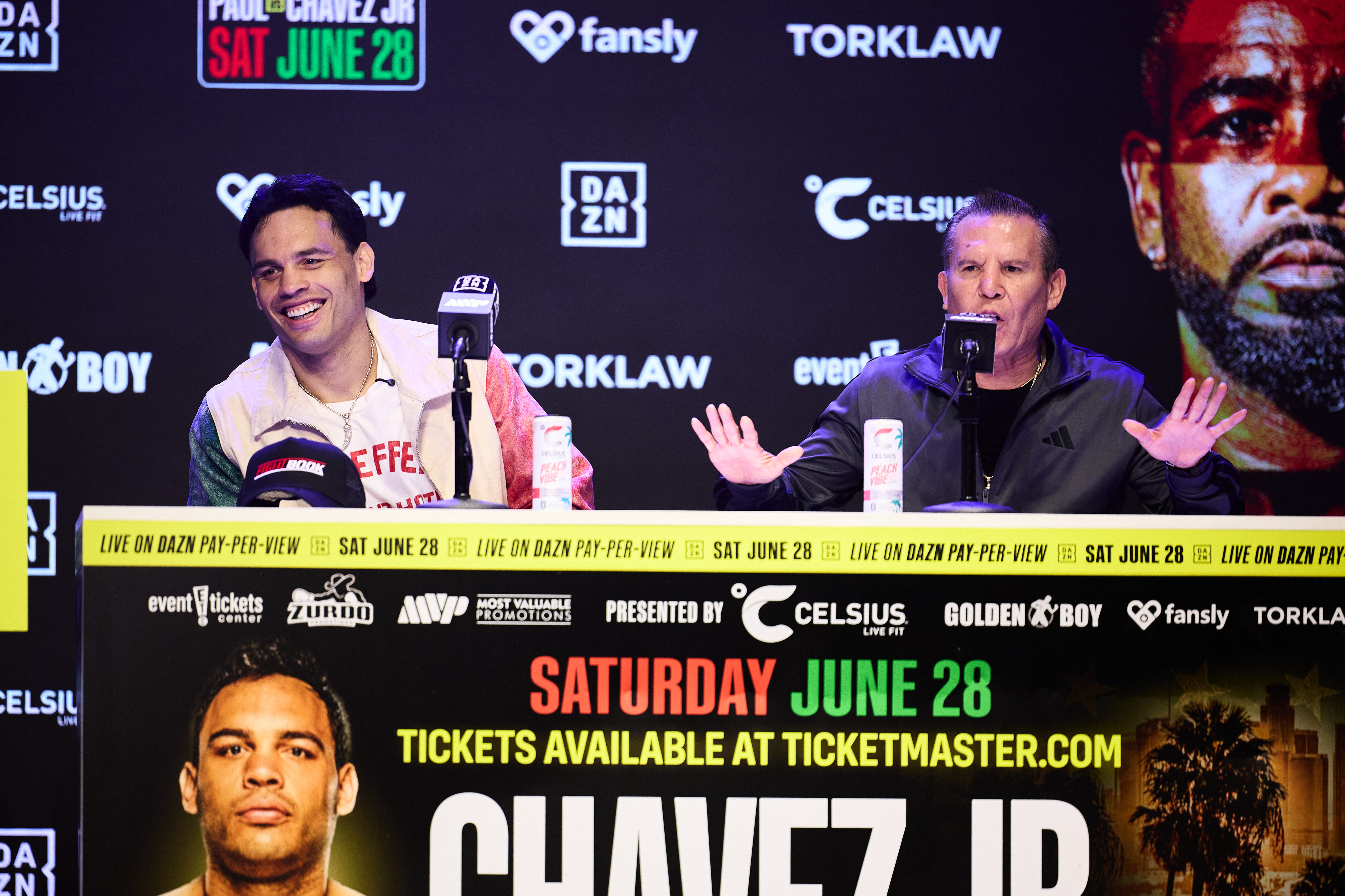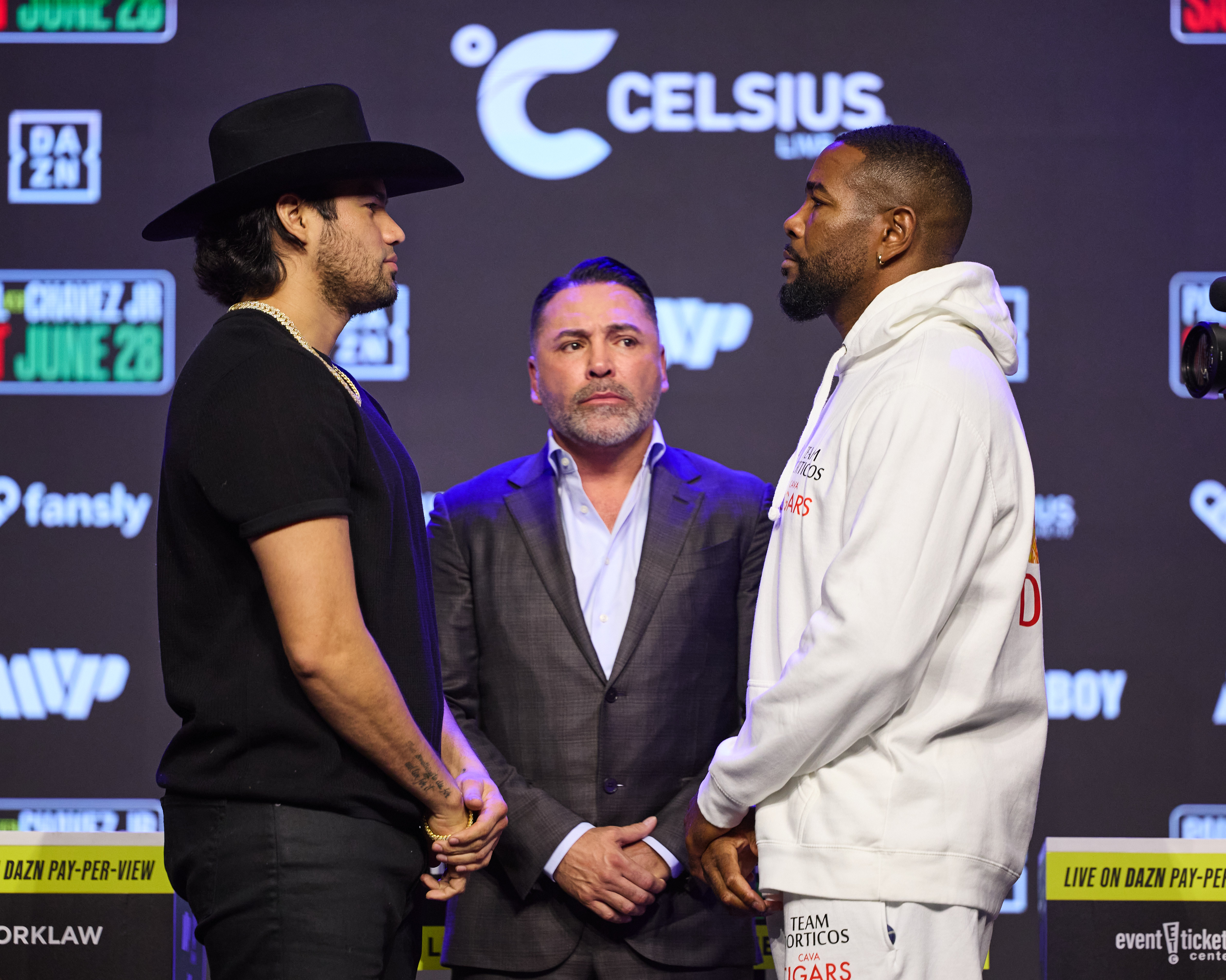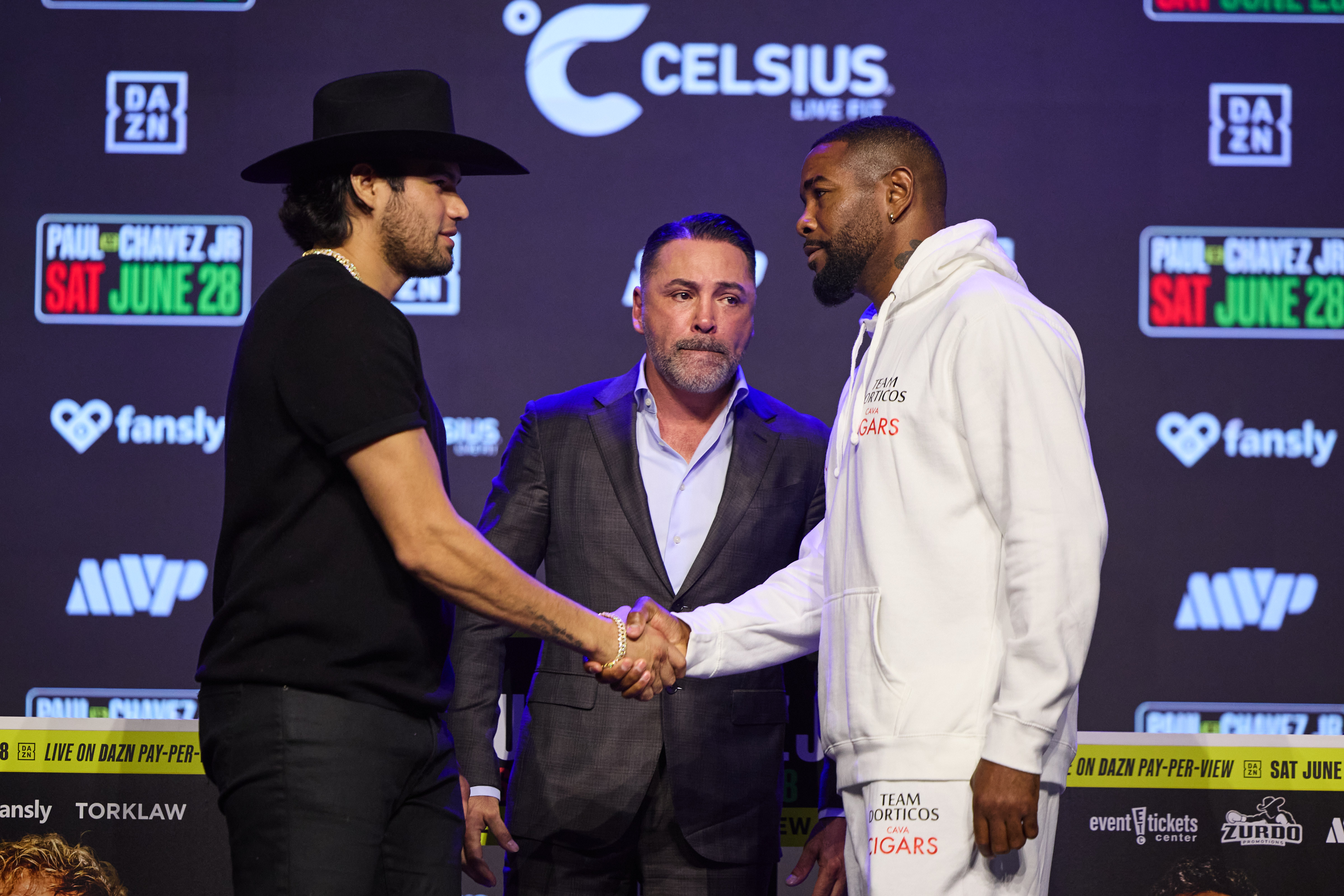 LOS ANGELES, CA – Today at the Avalon Hollywood Theater in Los Angeles, CA, The Problem Child, Jake “El Gallo de Dorado” Paul (11-1, 7 KOs) and Mexico’s former champion Julio Cesar Chavez Jr. (54-6-1, 34 KOs) met face-to-face to preview their highly anticipated Most Valuable Promotions (MVP) bout. This event will air live globally on DAZN pay-per-view on Saturday, June 28, from Honda Center in Anaheim, California, and is presented by CELSIUS Live Fit Essential Energy with Golden Boy Promotions serving as an official licensed promoter. Paul vs. Chavez is also sponsored by Event Ticket Center and Fansly. All tickets are on sale now via Ticketmaster