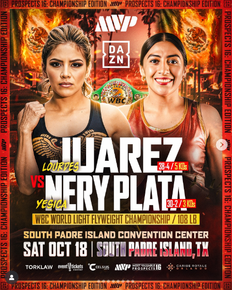 SOUTH PADRE ISLAND, TX – Most Valuable Promotions (MVP) today announced the company’s return to Texas for Most Valuable Prospects 16, an MVP Championship Double Header on Saturday, October 18 at the South Padre Island Convention Center in South Padre Island, Texas, available globally on DAZN. The Most Valuable Prospects 16 Championship Double Header will be headlined by Mexico’s WBC world champion Lourdes “La Pequeña Lulu” Juarez (38-4, 5 KOs) vs. MVP’s Mexican superstar and #1 WBA contender Yesica Nery Plata (30-2, 3 KOs), in a 10-round women’s world championship fight at 108lbs for the WBC light flyweight world title. The co-main event will feature Brownsville, Texas native Omar “El Relampago” Juarez (19-2, 7 KOs) vs. Caguas, Puerto Rico’s Omar “The New Era” Rosario (14-2, 4 KOs) in a 10-round bout at 140lbs in the super lightweight division. Also on the main card as part of the Championship Double Header will be MVP’s unified world champion Desley “Destroyer” Robinson (10-3, 3 KOs), who will defend her unified IBF and WBO middleweight world titles against Logan Holler (11-3-1, 4 KOs) over 10 rounds at 160lbs.