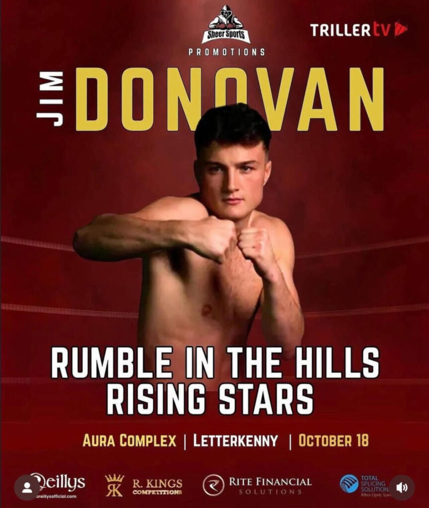 NEW YORK – Irish middleweight Jim Donovan (1-0) returns to the ring October 18, fighting on the “Rumble In The Hills” card at Aura Complex in Letterkenny, County Donegal, Ireland, just five weeks after his professional debut.