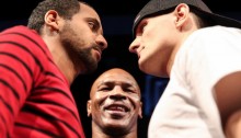 MAIN EVENT FIGHTER STARE-DOWN — (L-R) Alexei Collado, IMP president Mike Tyson and Rod Salka