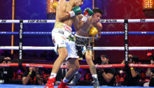 LAS VEGAS — Rafael “El Divino” Espinoza, the 6’1″ featherweight destroyer, lived up to his nickname. Espinoza defended his WBO title for the first time with a fourth-round TKO over Mexican countryman Sergio Chirino in the main event Friday evening in front of a sold-out crowd inside BleauLive Theater at Fontainebleau Las Vegas.